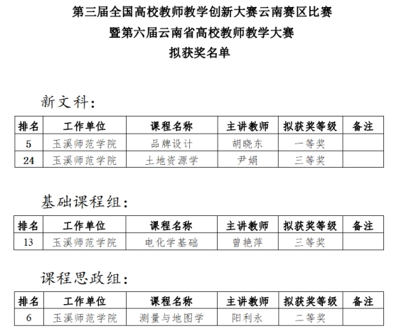 近日,云南省教育厅发布了《云南省教育厅关于第三届全国高校教师教学创新大赛云南赛区比赛暨第六届云南省高校教师教学大赛结果的公示》,现公示结束,我校四位教师喜获佳绩。