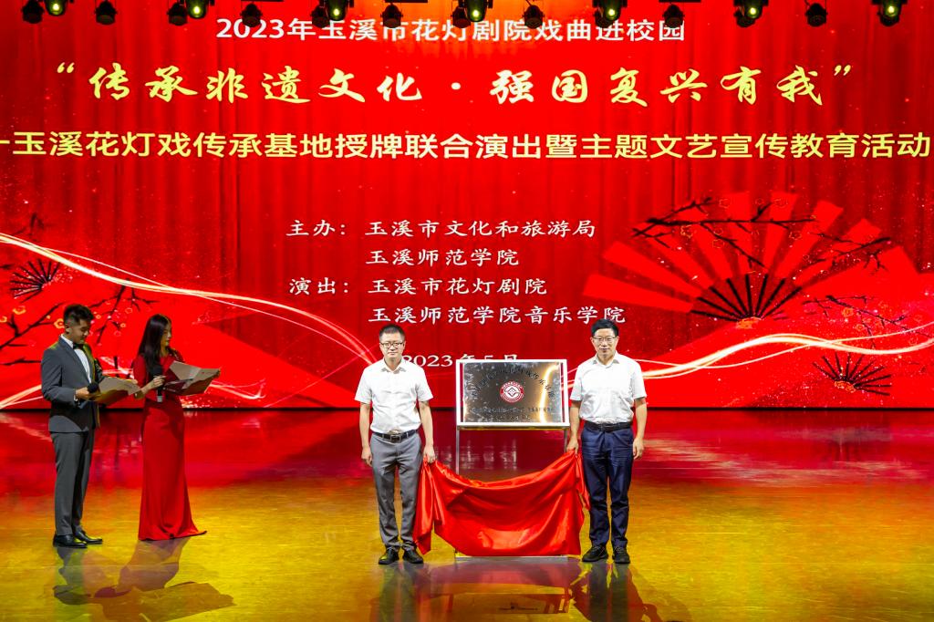 5月18日晚,2023年玉溪市花灯剧院戏曲进校园主题文艺宣传教育活动在玉溪师范学院音乐学院举行,玉溪师范学院花灯戏非物质文化遗产传承基地揭牌。