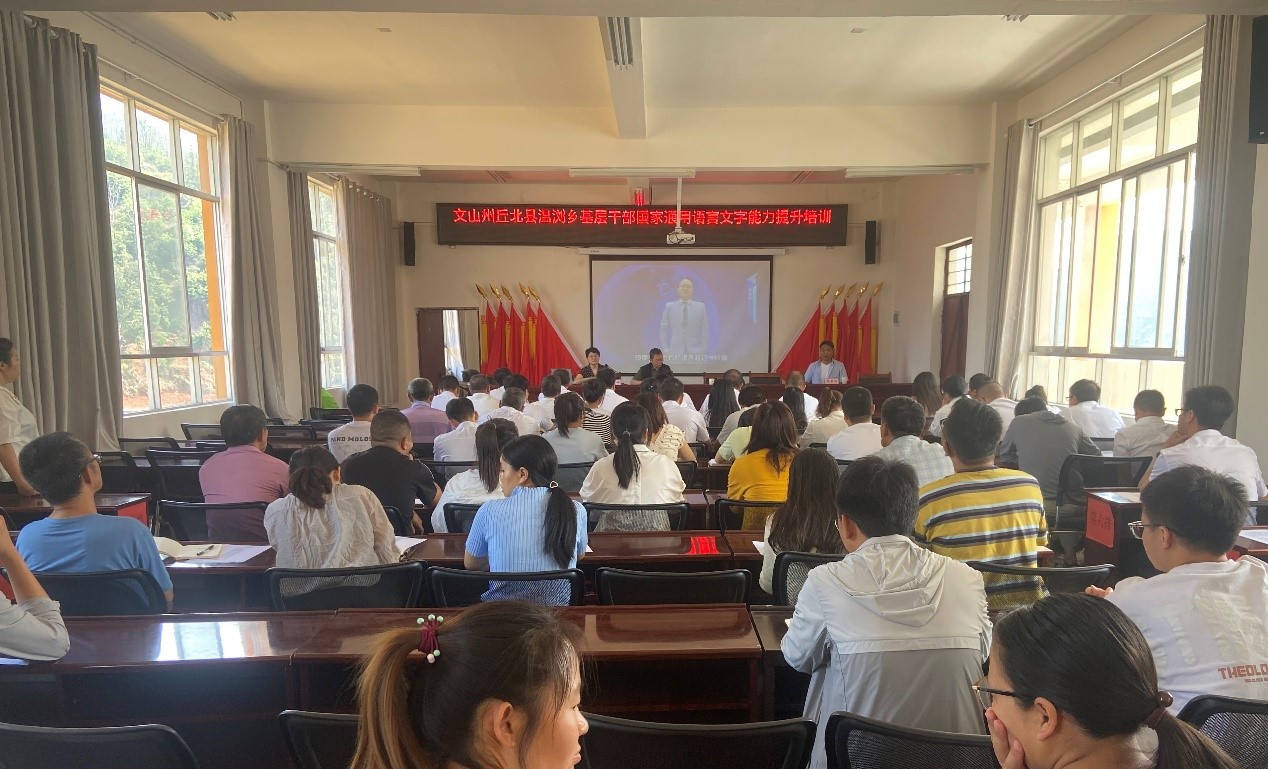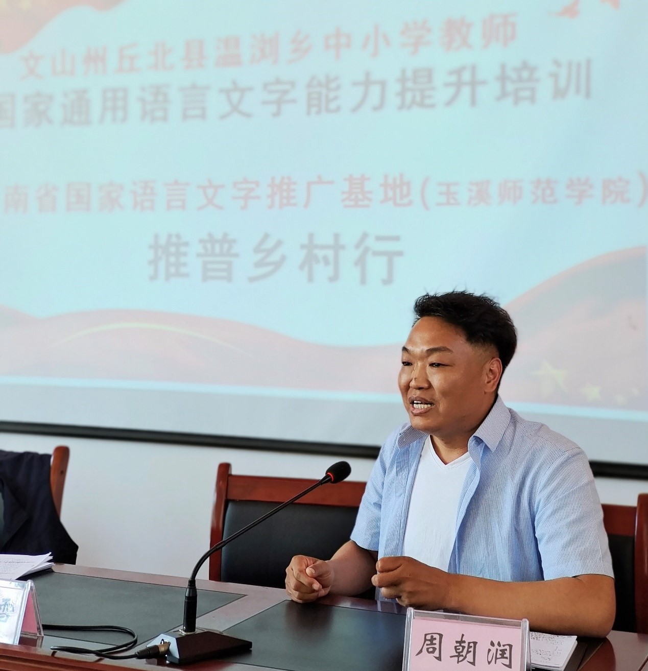 在丘北县温浏乡政府和坝稿村,基地团队面向温浏乡基层干部、党员、少数民族群众分别开展国家通用语言文字能力提升培训,培训中融入国家语言文字政策宣讲、二十大报告金句热词朗读,爱国主义诗歌朗诵、乡村振兴政策快板说唱、“语言文字助力乡村振兴APP”推广等形式,以参培人员喜闻乐见的方式推广国家通用语言文字,传承弘扬中华优秀语言文化,进一步铸牢中华民族共同体意识。