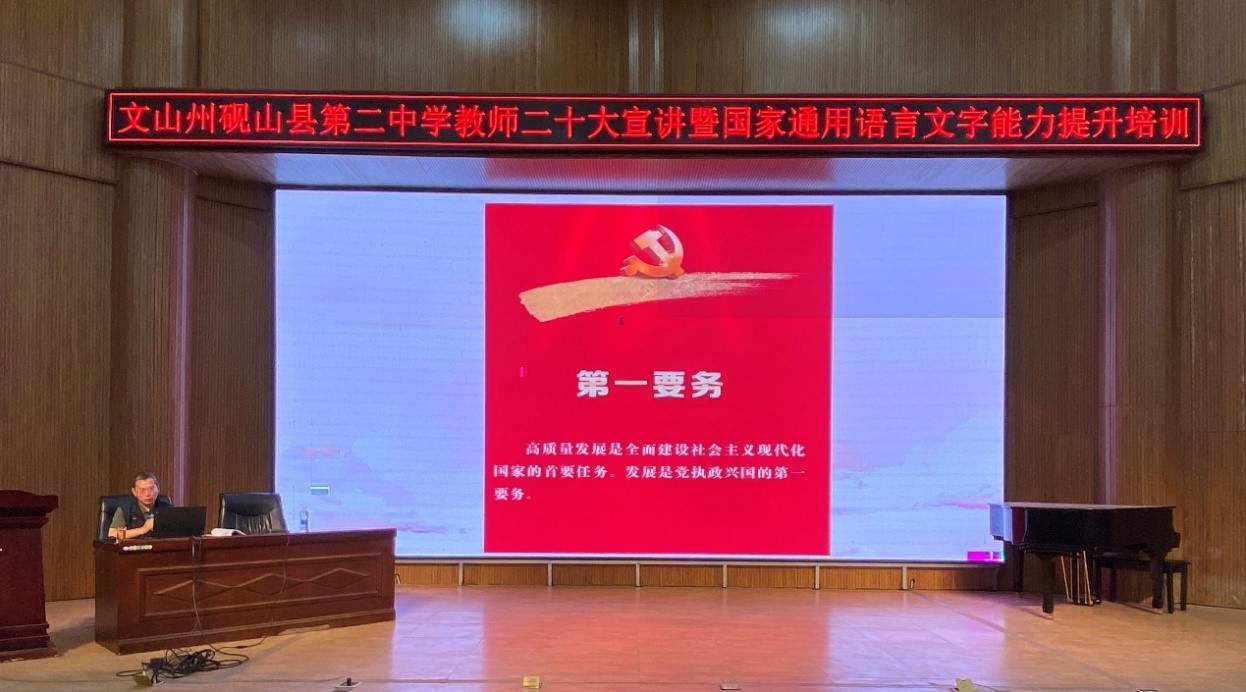 国家级普通话测评员、省演讲学会玉溪语言艺术培训基地主任金国东为砚山县第二中学教师作培训
