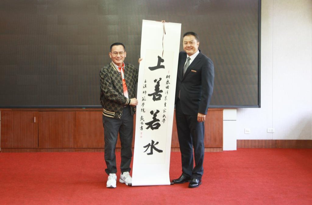 段红云代表玉溪师范学院向泰国清莱皇家大学赠送纪念两校合作20年书法作品。