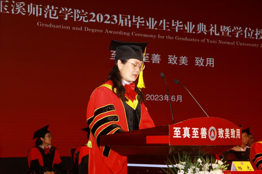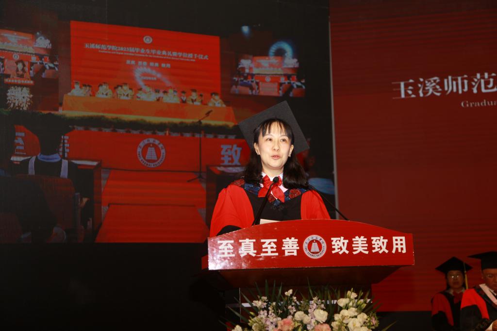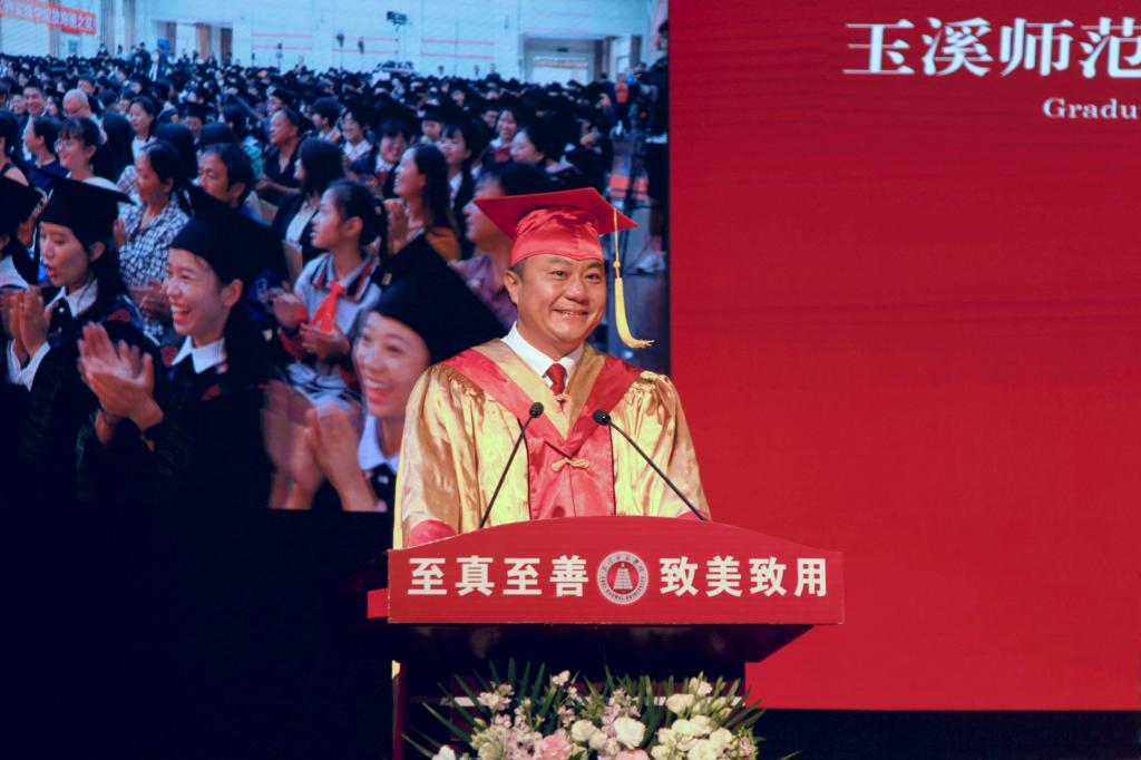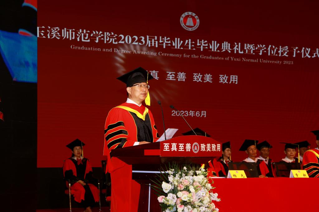 校长段红云研究员致辞。他代表学校向全体毕业生致以热烈的祝贺和美好的祝福;向四年来为大家成长成才付出辛劳的老师们、家长们,向关心帮助大家的员工、校友和社会各界人士表示衷心的感谢;与大家共同回顾了四年来在玉师学习、生活的点点滴滴;对即将走出象牙塔,踏上新征程的同学们提出殷切希望。