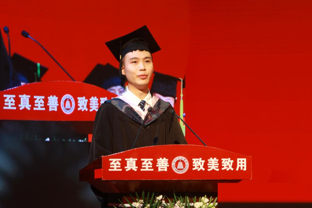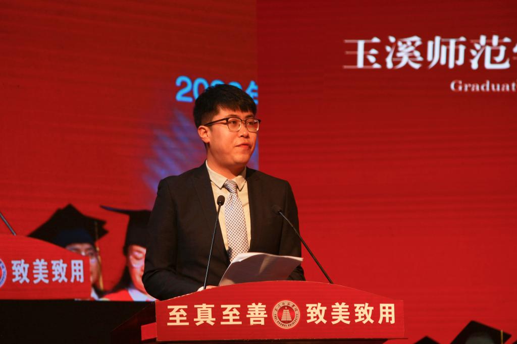 文学院新闻学专业吴翼君作为毕业生代表发言。他盘点了学校领导、教师对同学们的关心关怀,回顾了自己在玉师的成长与蜕变,向所有关心、帮助自己的领导、师长和亲友表示感谢。希望同学们牢记玉师“至真至善 致美致用”校训,做积极向上的践行者,开拓创新的前行者。