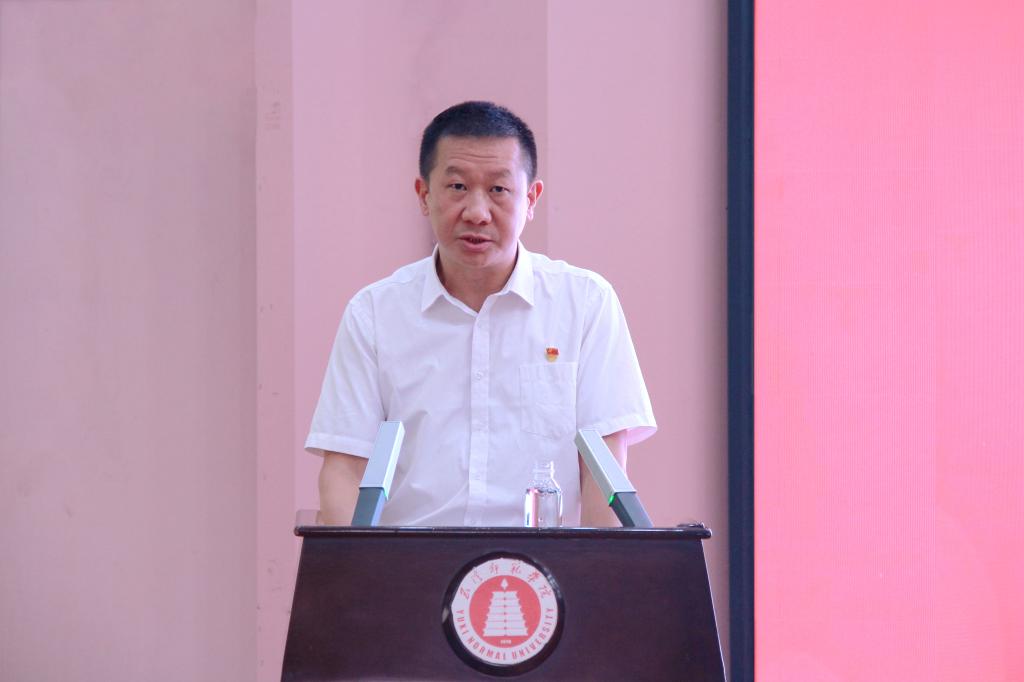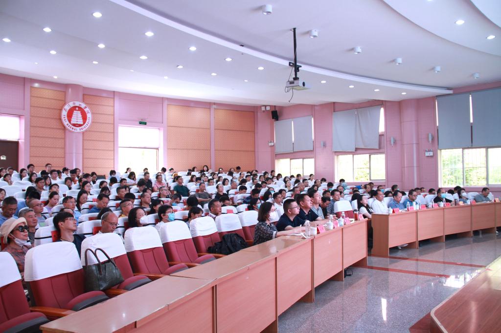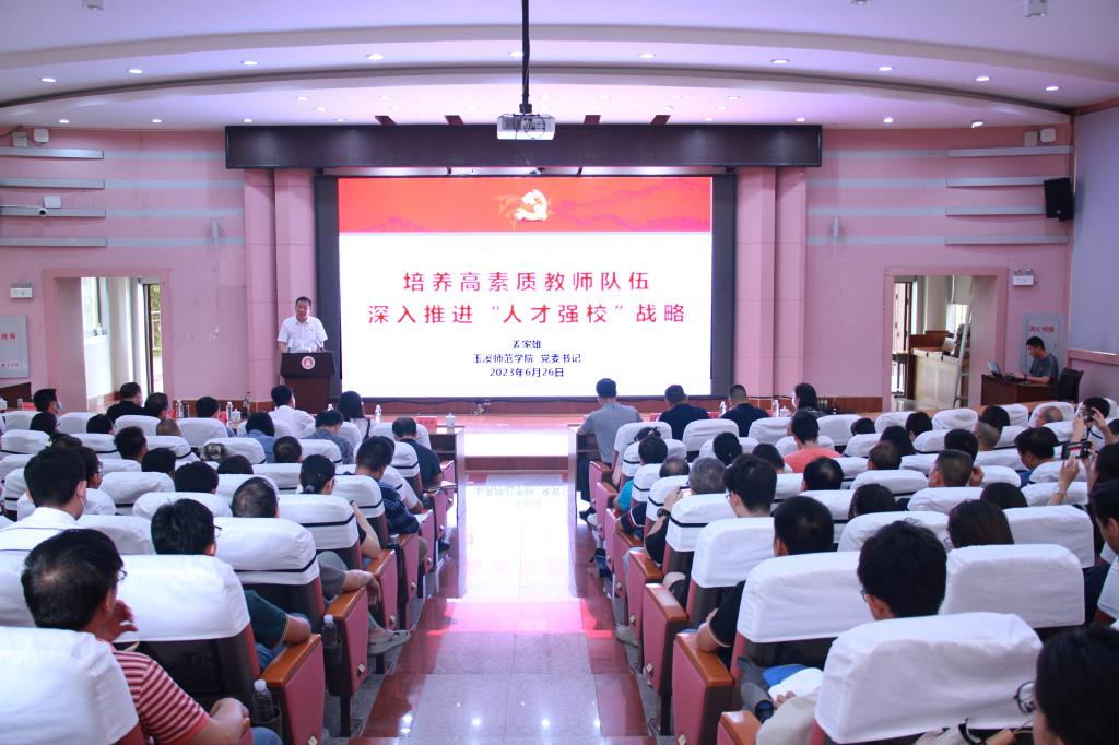6月26日下午,玉溪师范学院“学习贯彻习近平新时代中国特色社会主义思想”主题教育党委书记专题党课在科学讲堂举行,校党委书记姜家雄以“培养高素质教师队伍 深入推进‘人才强校’战略”为题,为师生们讲授专题党课。省委第十八巡回指导组副组长、省生态环境厅副厅级督察专员李国墅,巡回指导组成员唐昀平、邱有昆、方颖到会指导;学校党政领导班子成员、处级领导干部、各党支部书记和师生代表200余人参加党课。