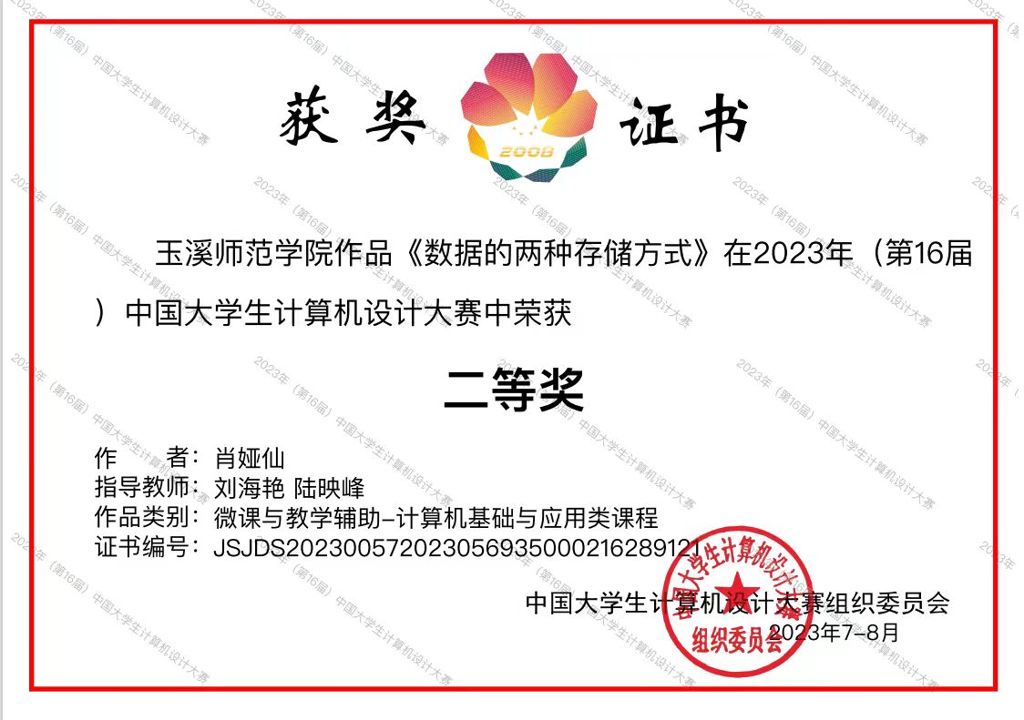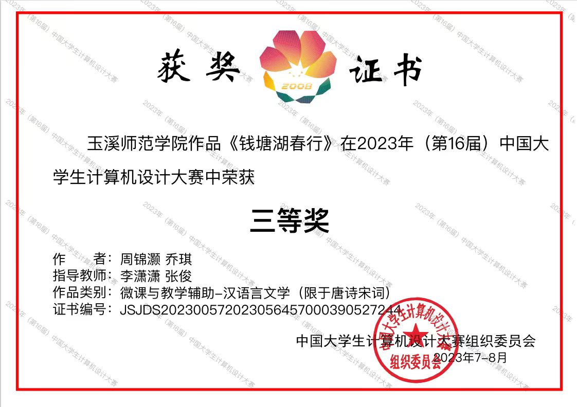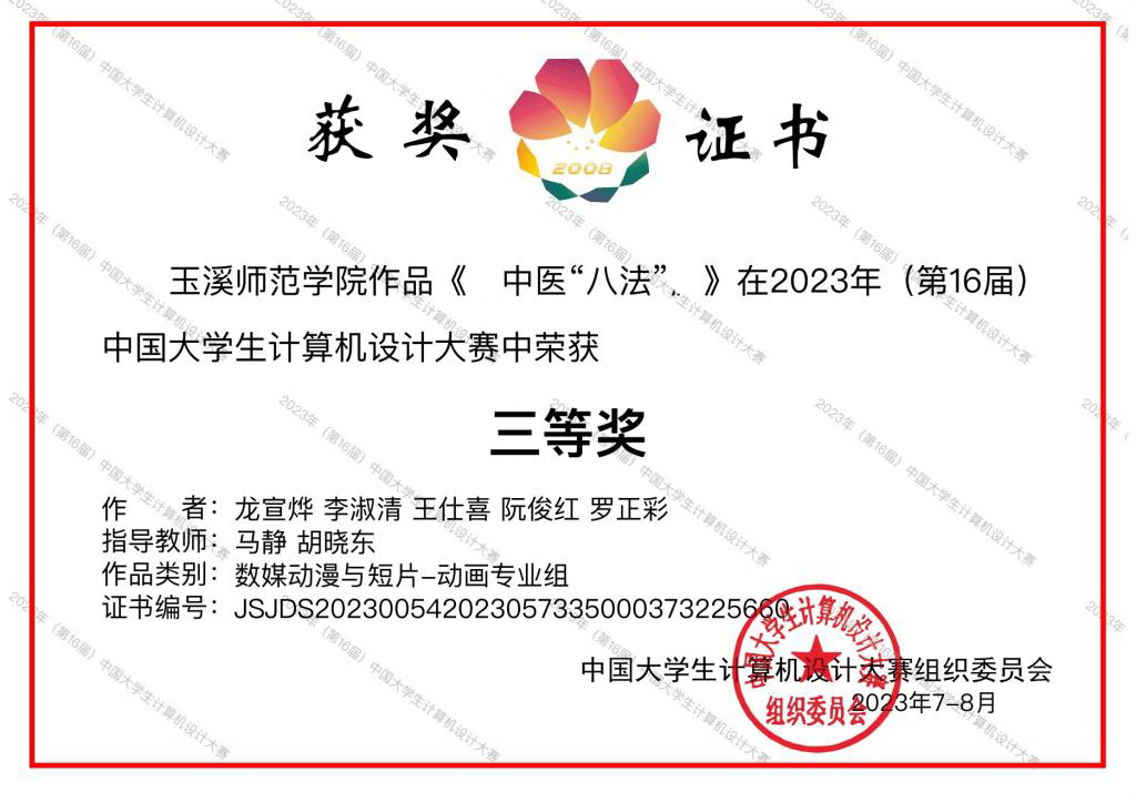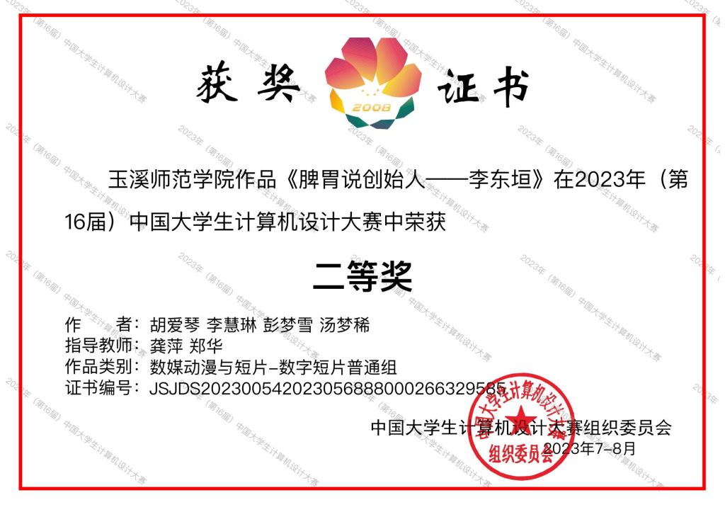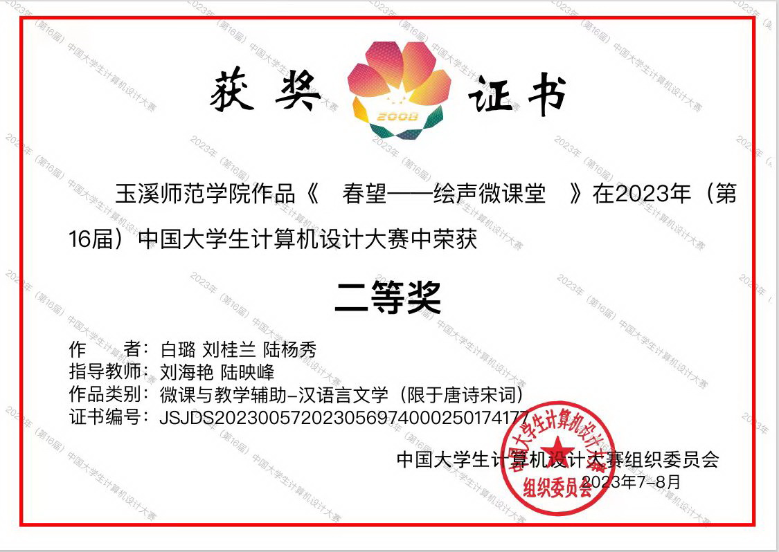 2023年(第16届)中国大学生计算机设计大赛国赛决赛于2023年7月—8月,在沈阳、厦门、上海、杭州等地举行。我校在国赛中喜获佳绩,获国赛二等奖4项、三等奖2项。数信学院由刘海艳、陆映峰指导的作品《春望-绘声微课堂》(作者:白璐、刘桂兰、陆杨秀)、《数据的两种存储方式》(作者:肖娅仙)获国赛二等奖;教师教育学院由龚萍、郑华指导的作品《脾胃说创始人—李东恒》(作者:胡爱琴、李慧琳、彭梦雪、汤梦稀)获国赛二等奖;美术学院由马静、杨凤梅指导的作品《四诊法》(作者:李晓银、杨雨华、叶奕雯、刘锦诺)获国赛二等奖,马静、胡晓东指导的作品《中医八法》(作者:龙宣烨、李树清、王仕喜、阮俊红、罗正彩)获国赛三等奖;文学院由李潇潇、张俊指导的作品《钱塘湖春行》(作者:周锦灏、乔琪)获国赛三等奖。