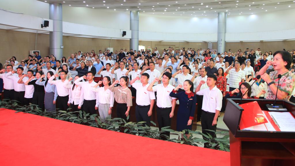 新入职教师在荣退教师代表丁丽萍领誓下入职宣誓。
