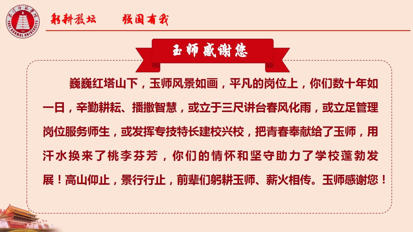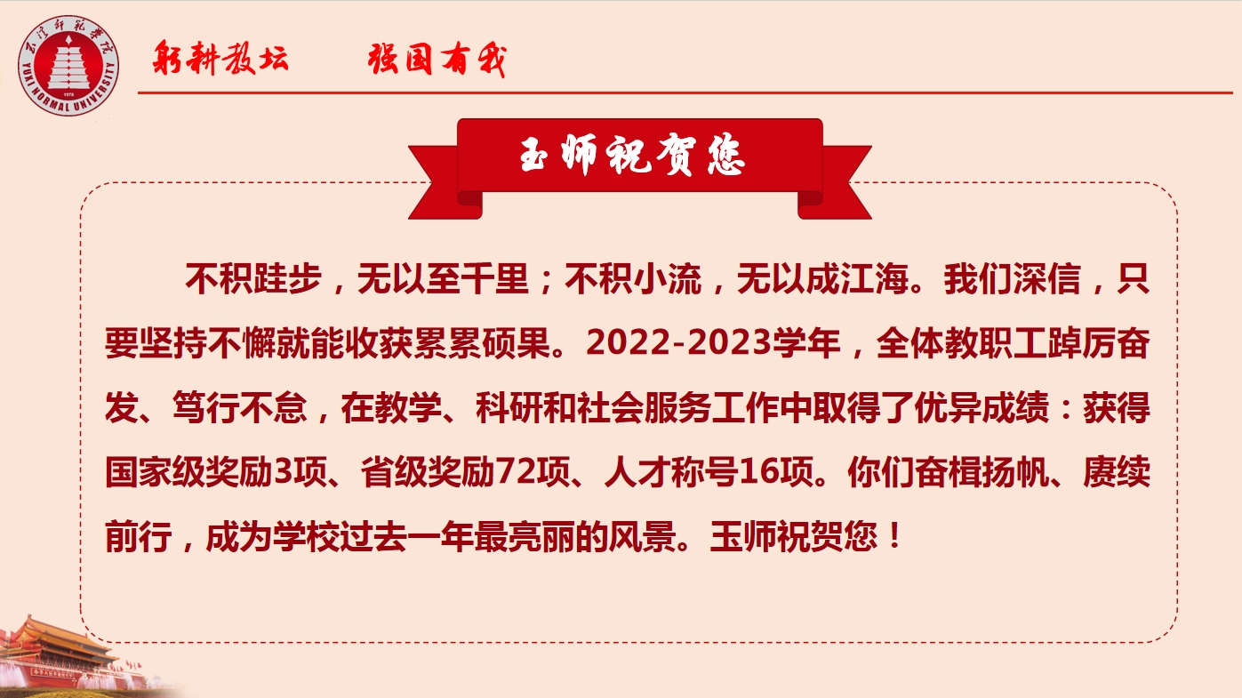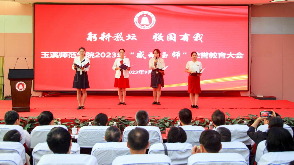 9月8日下午,为弘扬尊师重教优良传统,激励广大教师潜心教书育人,积极投身教育强国建设,在第39个教师节来临之际,玉溪师范学院2023年“感动玉师”荣誉教育大会在图书馆多元学术报告厅举行。大会分为“玉师感谢您”“玉师祝贺您”“玉师欢迎您”三个篇章。