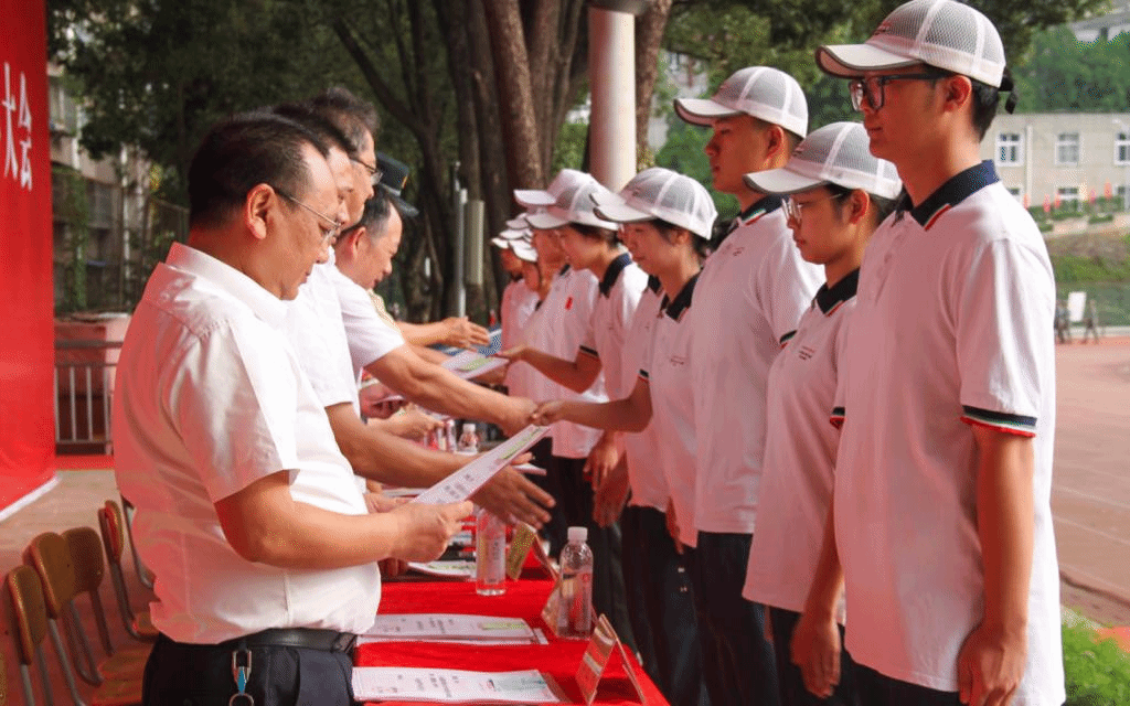 校领导及嘉宾为即将参军入伍的玉师学子整理绶带,颁发纪念品。