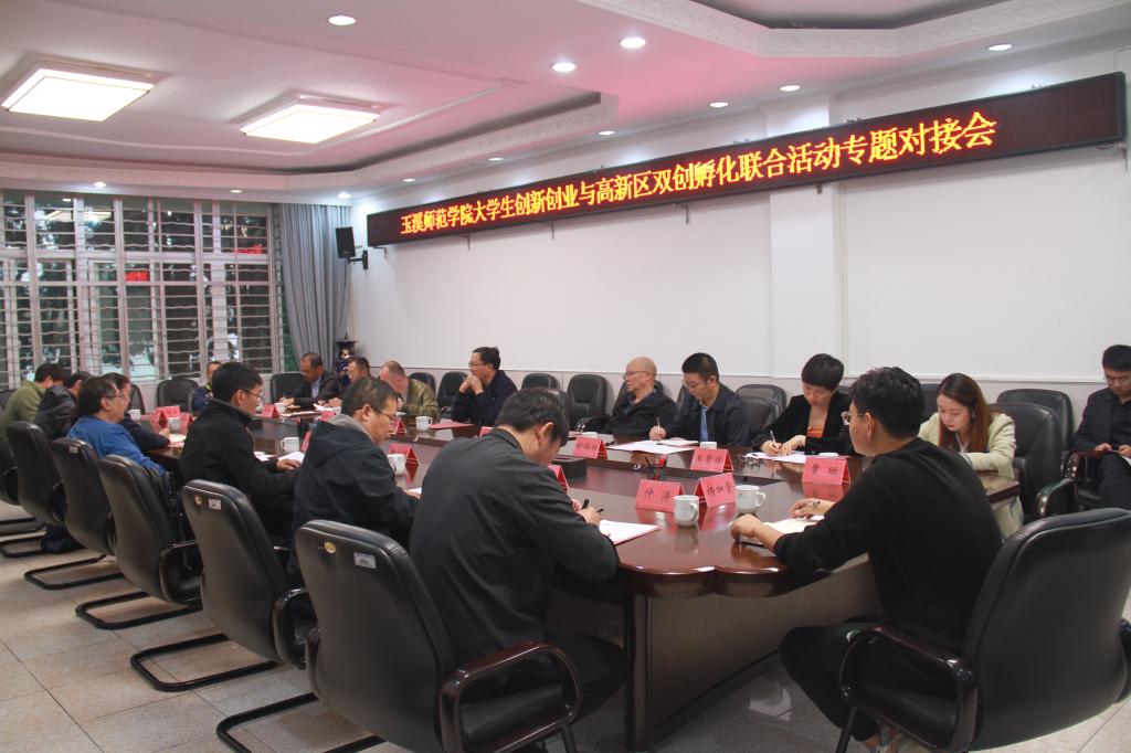 为搭建高校和高新区之间的交流平台,促进双方合作和共赢发展,10月9日上午,玉溪师范学院大学生创新创业与高新区双创孵化联合活动专题对接会在一办一楼会议室召开。玉溪市高新区党工委副书记戴兴德,高新区税务分局、市场监管局、经济发展局、玉溪互创企业管理公司负责人;玉溪师范学院党委委员、副校长李明,学生处、科技处、商学院、创新创业学院、玉溪经济社会会发展研究中心负责人等参加会议。会议由李明主持。