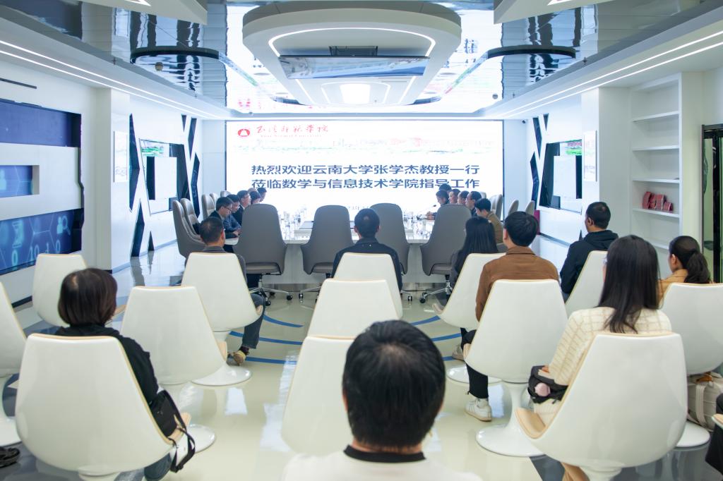 张学杰介绍了云南大学信息学院的学科建设、科学研究、产学研等方面情况,希望双方在学科建设、人才培养、科学研究、平台建设、师资队伍建设等方面加强合作,建立对口合作机制,实现优势互补、共同发展。李周红希望与云南大学信息学院在合作共赢基础上,推动数学与信息技术学院在人才培养、学科建设和科研平台建设等方面再上新台阶,实现高质量发展。