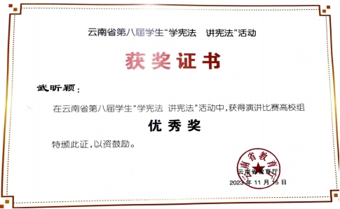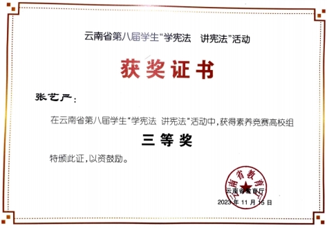 玉溪师范学院法学专业2021级学生张艺严获全省学生“学宪法 讲宪法”活动素养竞赛高校组三等奖(指导教师:朱艳英),法学专业2022级学生武昕颖获全省学生“学宪法 讲宪法”活动演讲比赛高校组优秀奖(指导教师:武正雄)。