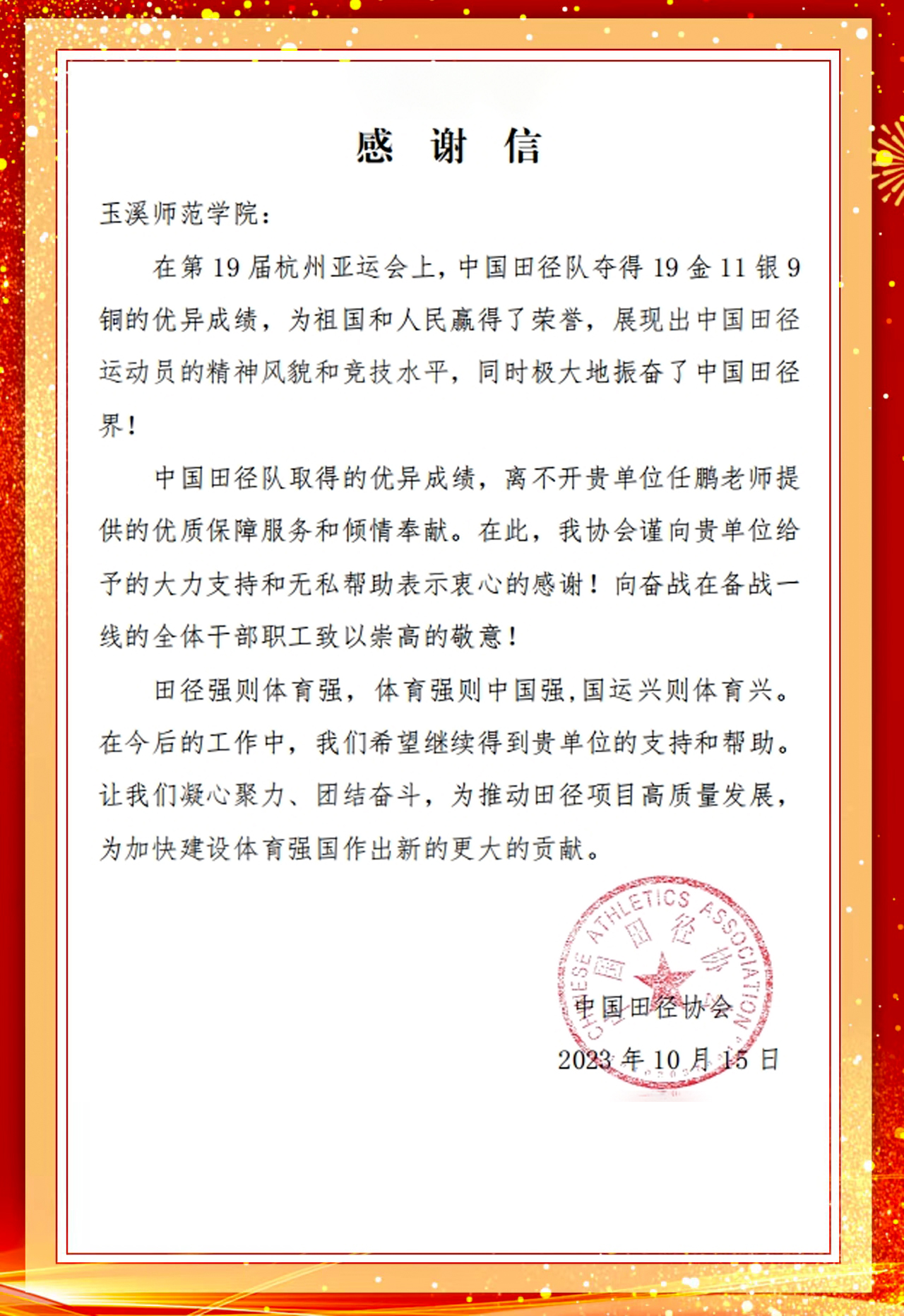 近日,玉溪师范学院收到中国田径协会的感谢信,特别感谢玉溪师范学院对中国田径队给予的大力支持和无私帮助。感谢信指出,在第19届杭州亚运会上,中国田径队夺得19金11银9铜的优异成绩,为祖国和人民赢得了荣誉,展现出中国田径运动员的精神风貌和竞技水平,同时极大地振奋了中国田径界!感谢信表示,中国田径队取得的优异成绩,离不开玉溪师范学院任鹏老师提供的优质保障服务和倾情奉献。