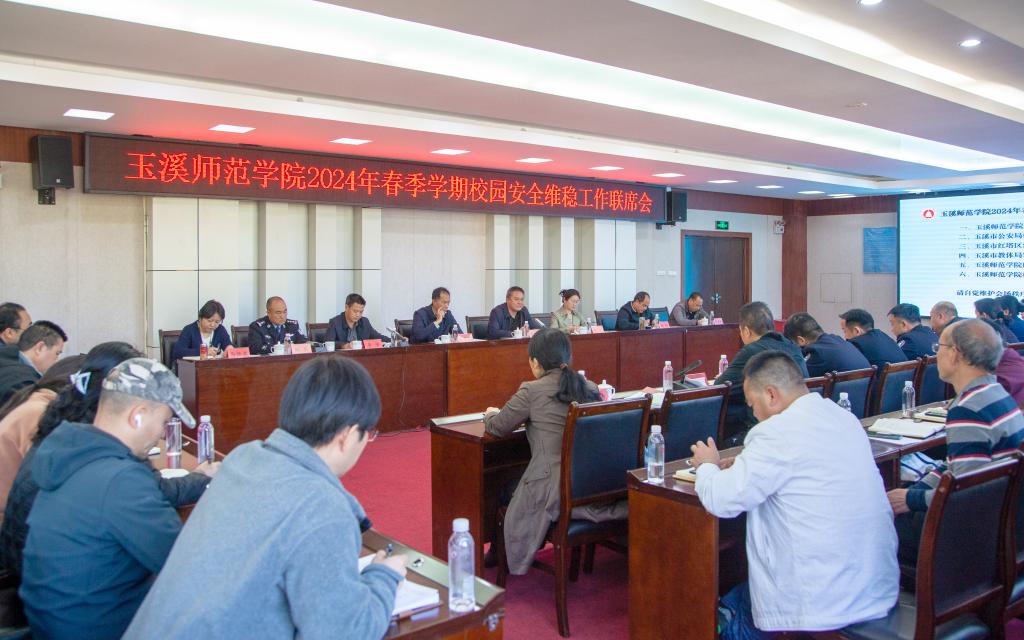 3月5日上午,玉溪师范学院在图书馆3003会议室召开2024年春季学期校园安全维稳工作联席会。玉溪市公安局、玉溪市红塔区消防救援大队、玉溪市教育体育局相关领导;玉溪师范学院党委副书记、校长段红云,党委副书记杨光、张亚辉,副校长杨伟、李涛,各二级党委书记、相关部门负责人参加会议。会议由李涛主持。