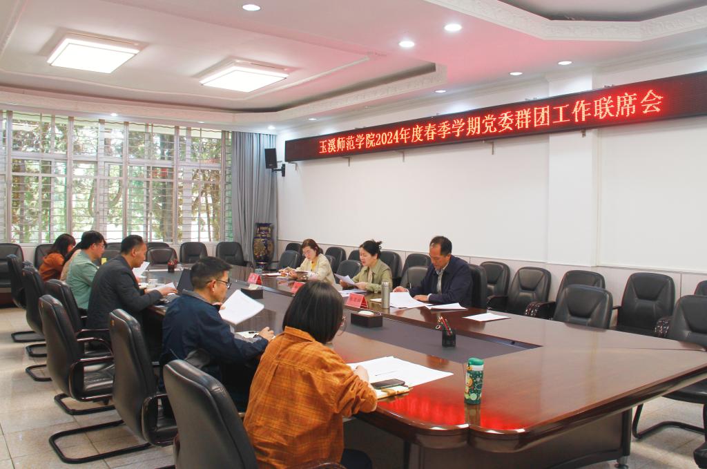 为强化党的政治引领,认真落实新时代群团工作新要求,3月5日下午,玉溪师范学院在一办一楼会议室召开2024年度春季学期党委群团工作联席会,就加强群团组织建设和2024年群团工作任务进行研究部署。校党委副书记杨光、张亚辉,宣传部、组织部、学生工作部、教师工作部、工会、团委、妇联等部门负责人参加会议。会议由杨光主持。