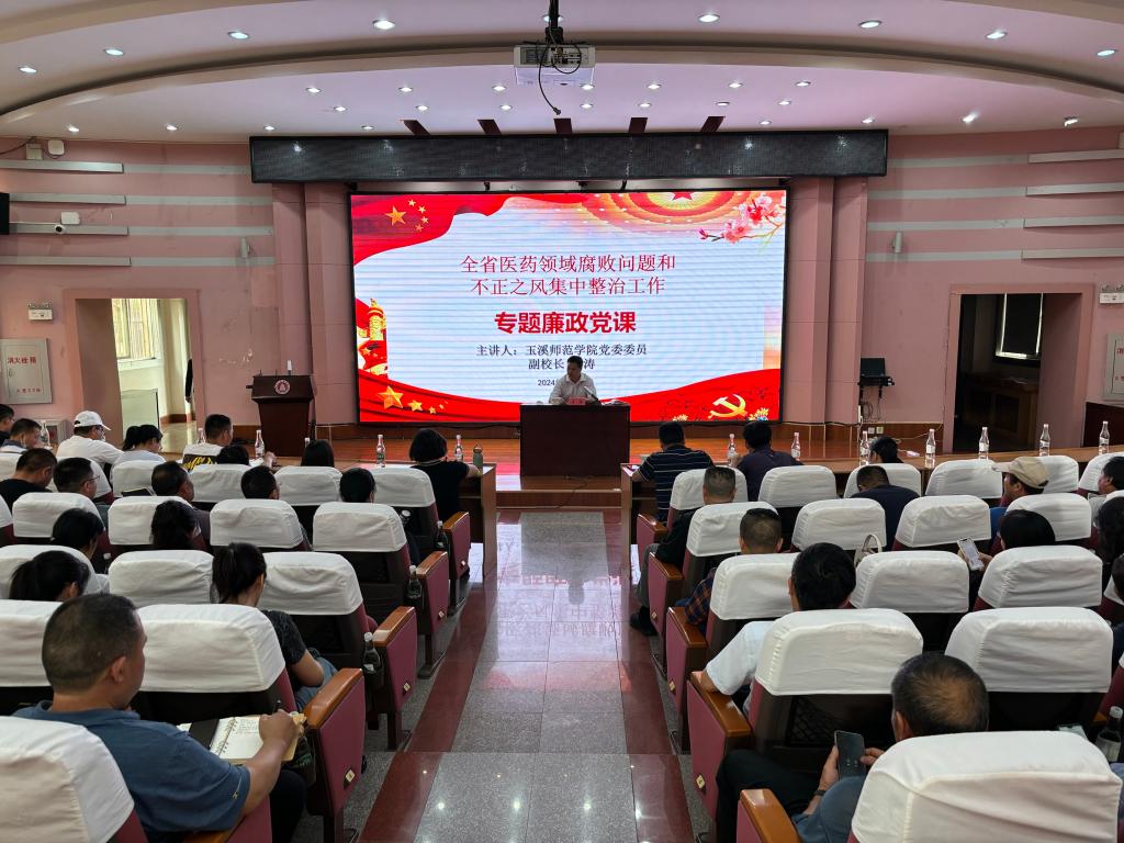 为认真贯彻落实“严”的基调和“严”的氛围要求,纵深推进全省医药领域腐败问题和不正之风集中整治工作,4月11日下午,学校党委委员、副校长李涛在科学讲堂为后勤服务中心全体员工,学生处、团委、保卫处、资产经营有限公司、音乐学院、文学院全体党员、干部讲授专题廉政党课。
