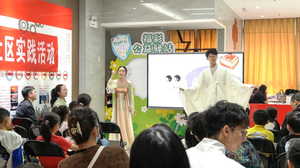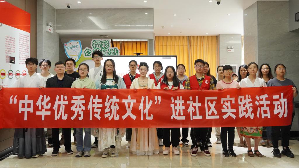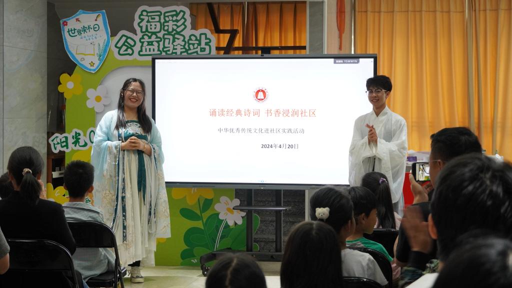 活动中,“中华优秀传统文化”实践团的同学们身着古风汉服,诵读诗词,吟唱经典,新颖有趣的表演形式迅速吸引了社区孩子和家长们的目光。实践团师生与参加活动的孩子们积极互动,教授诗词诵读与吟唱的方法,引导孩子们理解诗词内涵,使其切身感受中华古典诗词的魅力,激发对优秀传统文化的热爱。