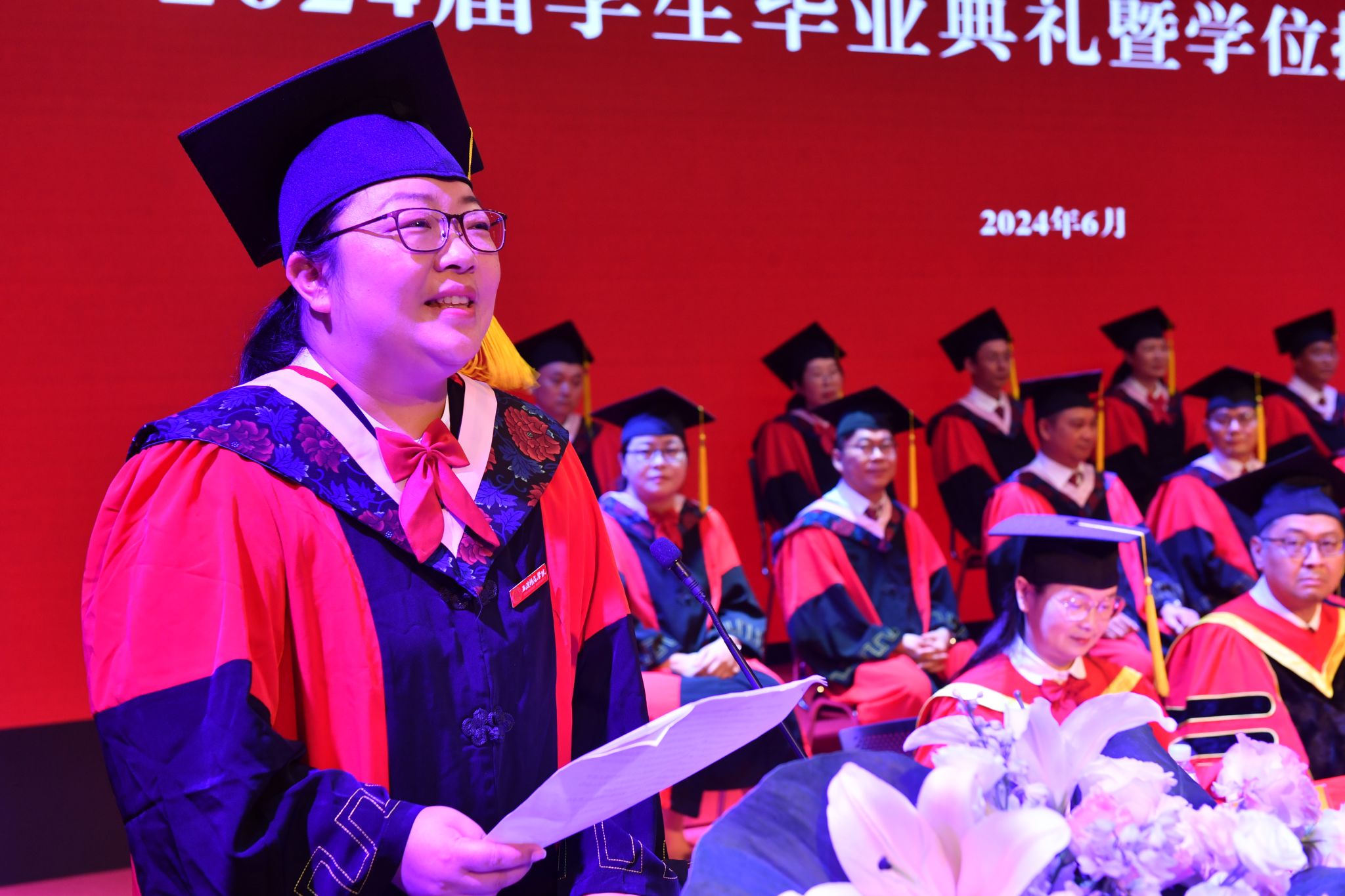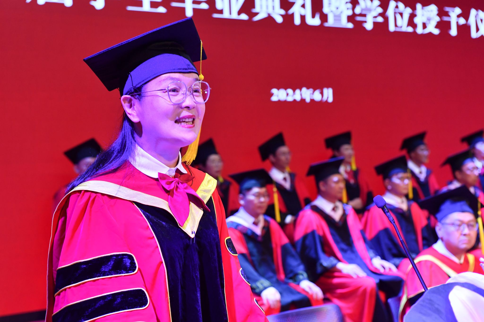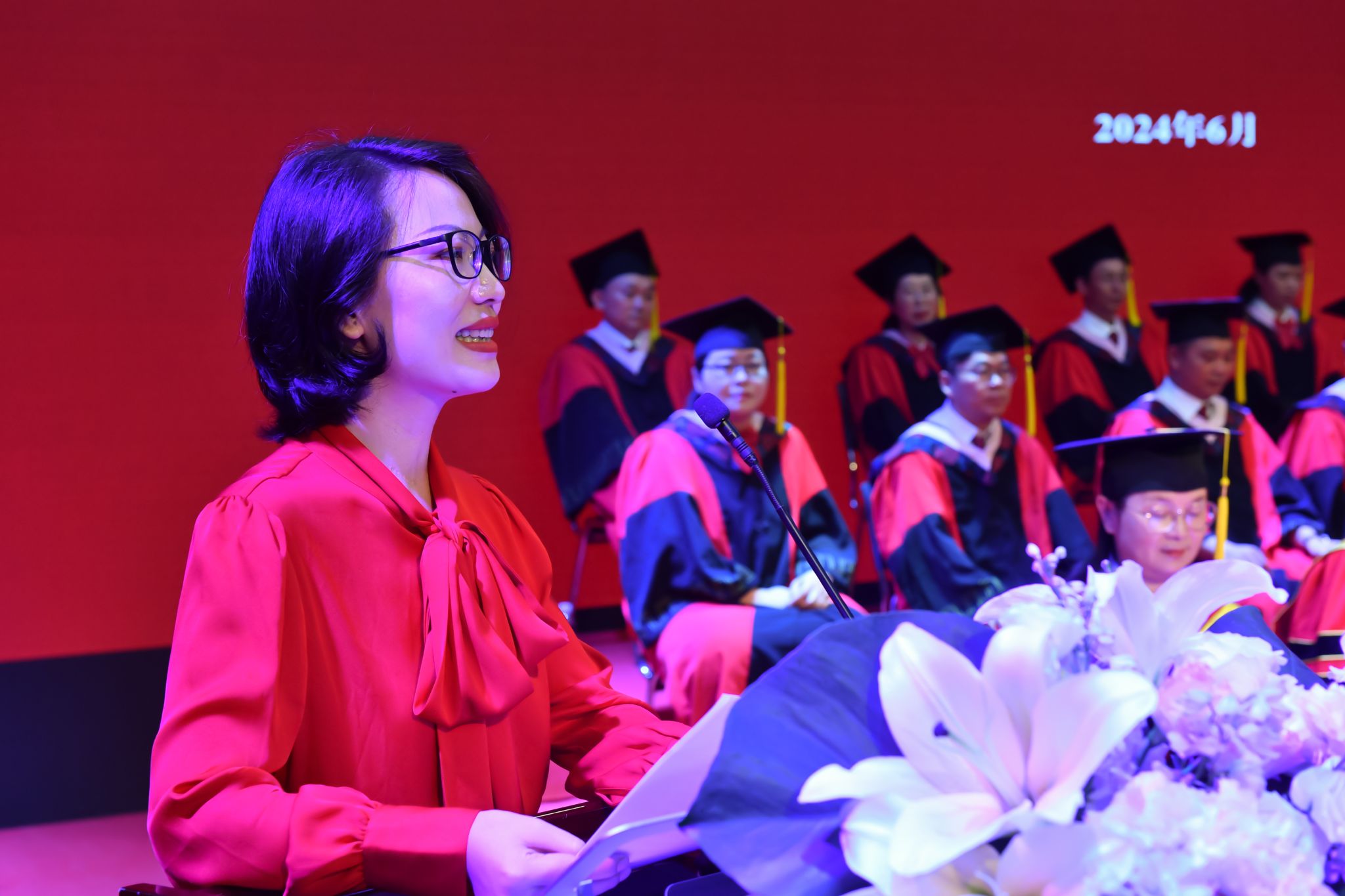 校党委副书记杨光主持毕业典礼。杨光表示,毕业典礼既是同学们学成毕业、喜获学位的荣光时刻,更是大家扬帆起航、奋斗创业的崭新开端。她祝福同学们在未来的人生旅程中,秉承“至真至善 致美致用”校训精神,学会“小德川流,大德敦化”“删繁就简,领异标新”“乘众人之智,用众人之力”,奋力书写为中国式现代化挺膺担当的青春篇章。