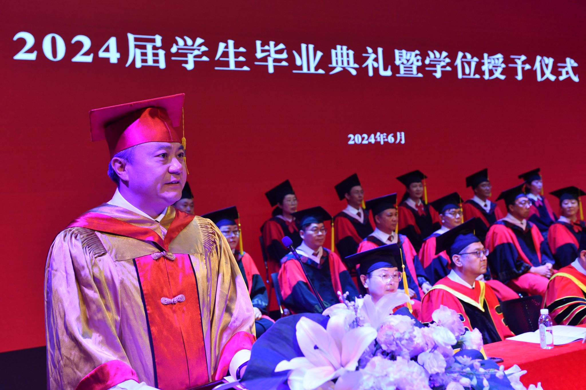 学校党政领导姜家雄、段红云、杨光、张亚辉、李长虹、章新、李明、杨伟、李涛,学士学位评定委员会委员,二级学院党政领导、职能部门负责人,校友代表、教师代表、2024届毕业生代表、家长代表参加毕业典礼。