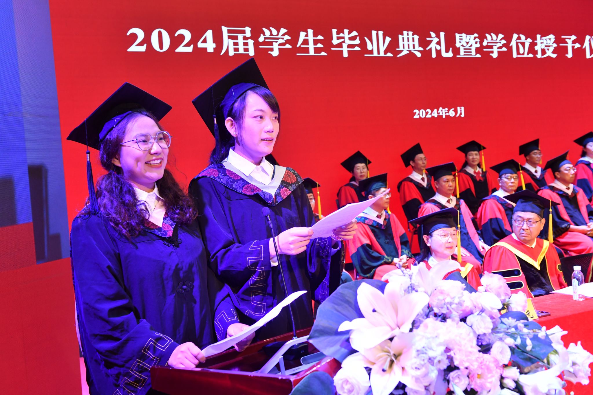 地理与国土工程学院毕业生卢宗琪、教师教育学院毕业生徐超群代表毕业生发言。她们回顾了在玉师成长的点滴,向所有关心、帮助、支持同学们的领导、师长和亲友表示诚挚感谢。希望同学们无论是读研深造,还是干事创业,都要以实际行动践行“至真至善 致美致用”校训精神,让青春在为祖国、为民族、为人民、为人类的不懈奋斗中绽放绚丽之花。