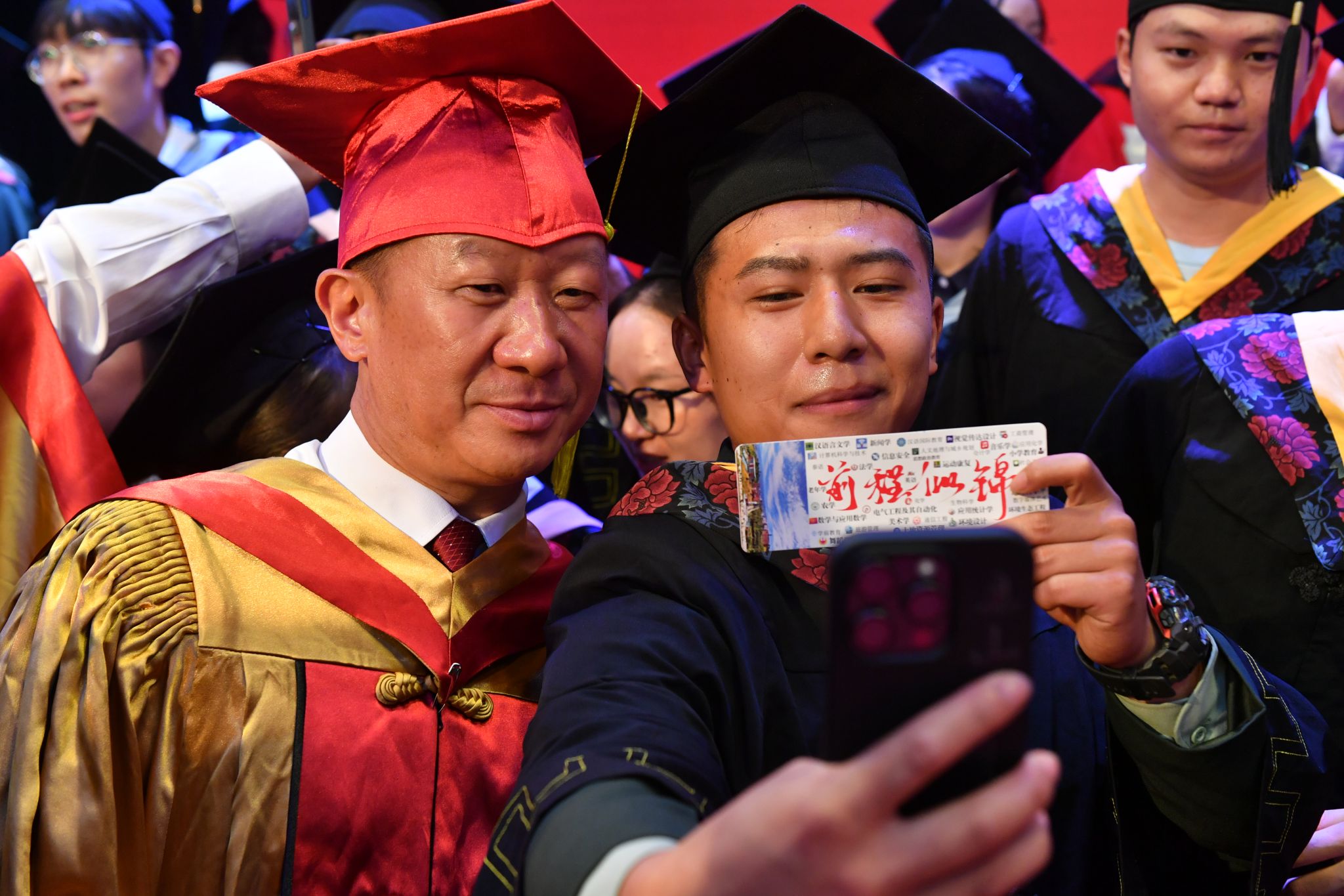 在主席台就座的学校领导、校学位委员会委员共同为2024届毕业生拨正流苏、颁授学位证书并合影留念。
