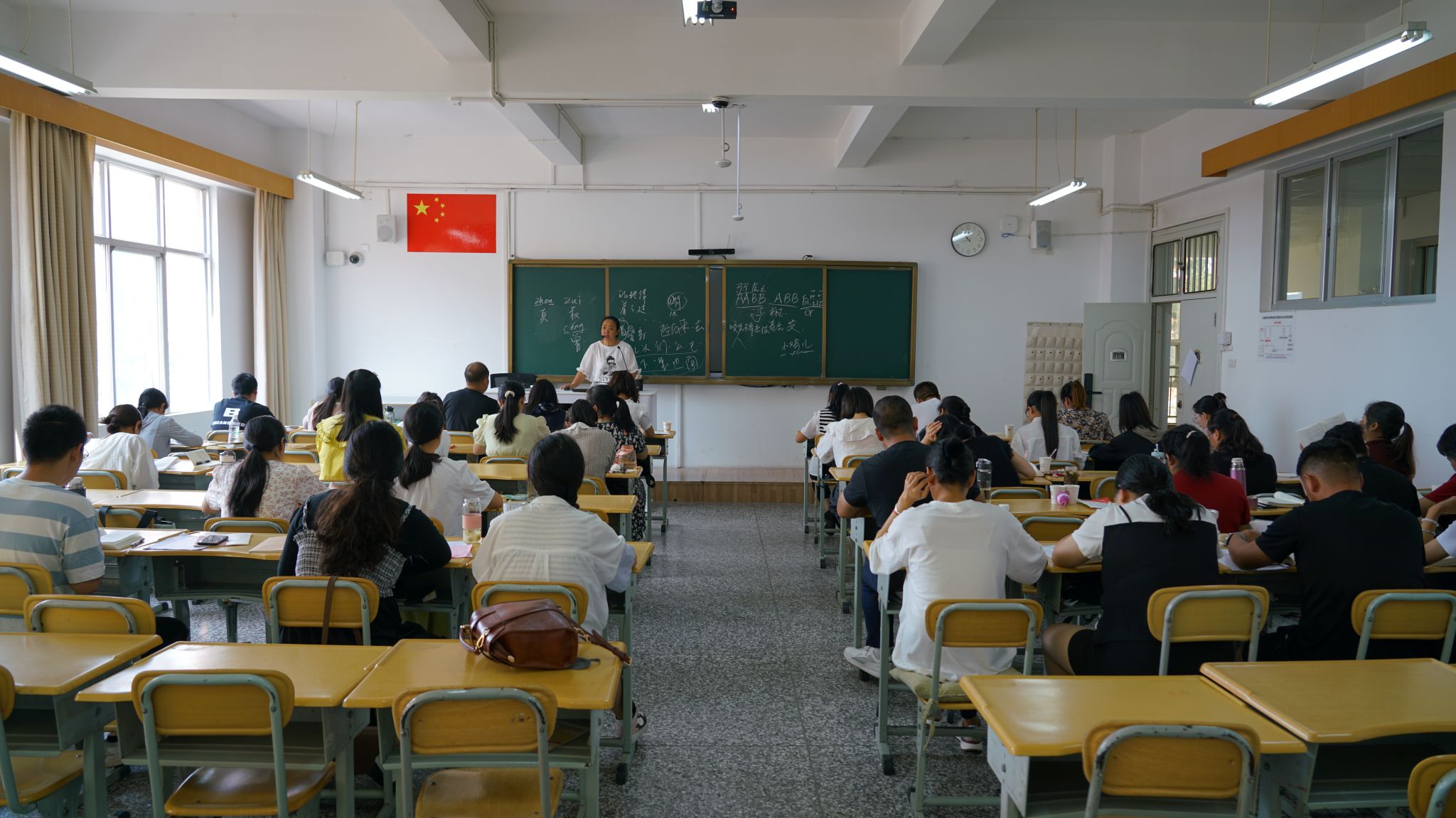 本次培训玉溪师范学院共派出6名国家级普通话测试员和23名省级普通话测试员组成普通话授课团队,选拔了10名大学生志愿者担任助教。培训期间,组织学员参加了普通话口语水平摸底测试和普通话机测考试,开设了国家语言文字工作政策、语言能力训练、语言教学能力提升、中华诗词鉴赏及诵读、普通话表达艺术综合演练等课程,通过小班教学、集中讲座、一对一正音、情景教学等不同形式,重点提升参训教师的普通话水平。