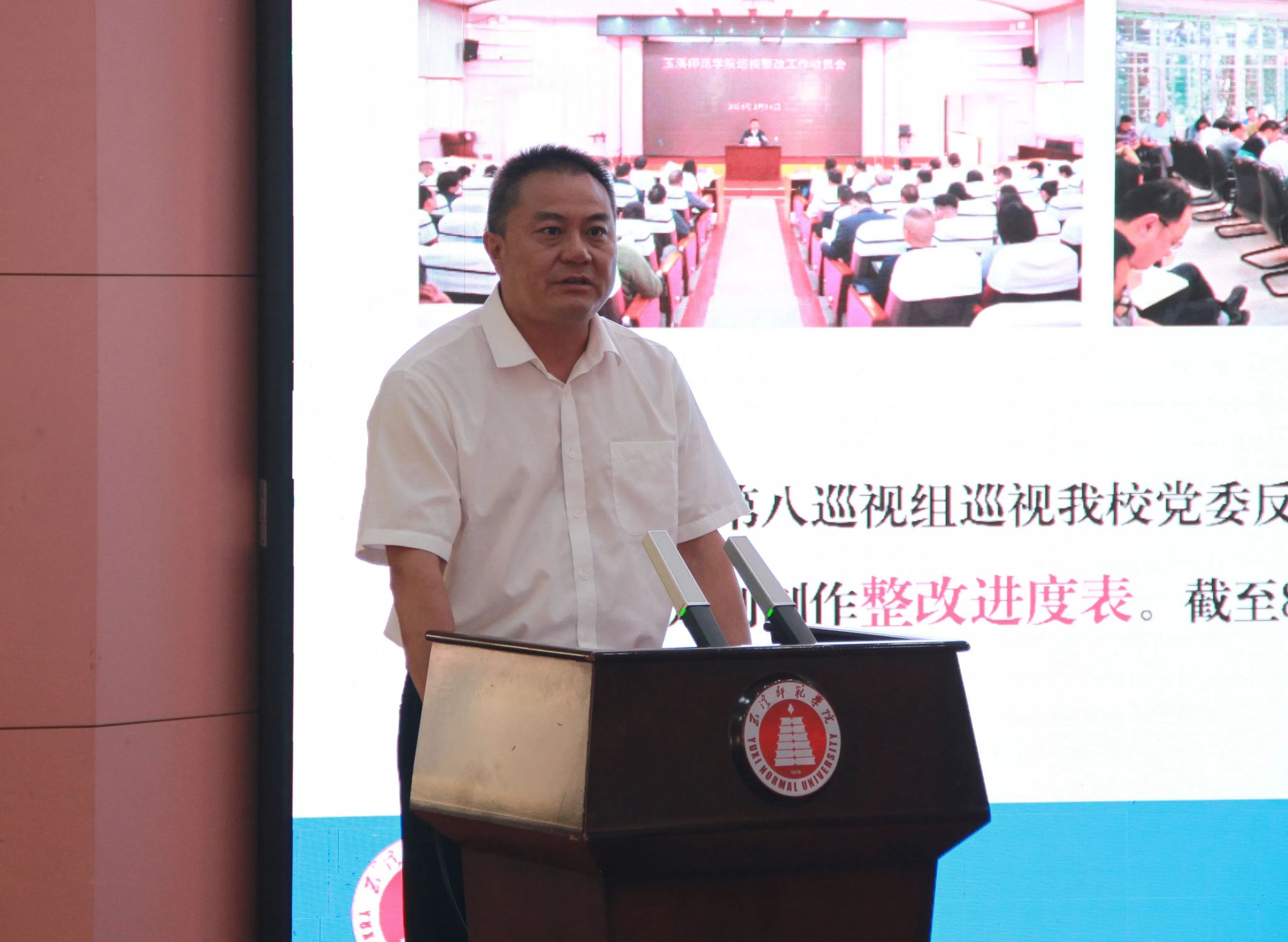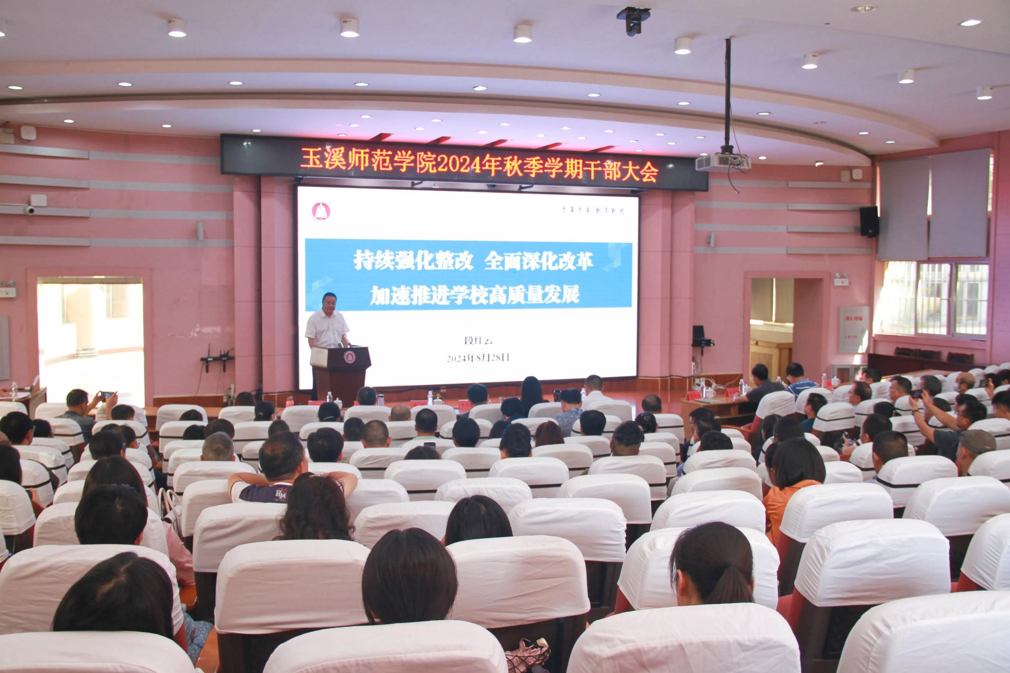8月28日下午,玉溪师范学院在科学讲堂召开2024年秋季学期干部大会。会议以习近平新时代中国特色社会主义思想为指导,认真学习贯彻党的二十届三中全会关于深化教育综合改革、科技体制改革、人才发展体制机制改革等内容精神,梳理总结2024年上半年学校主要工作,安排部署下半年重点工作。校党委书记姜家雄主持会议并讲话,校党委副书记、校长段红云作工作报告。学校党政领导、全体中层干部(含非实职)、职能部门科级干部、银龄教师参加会议。