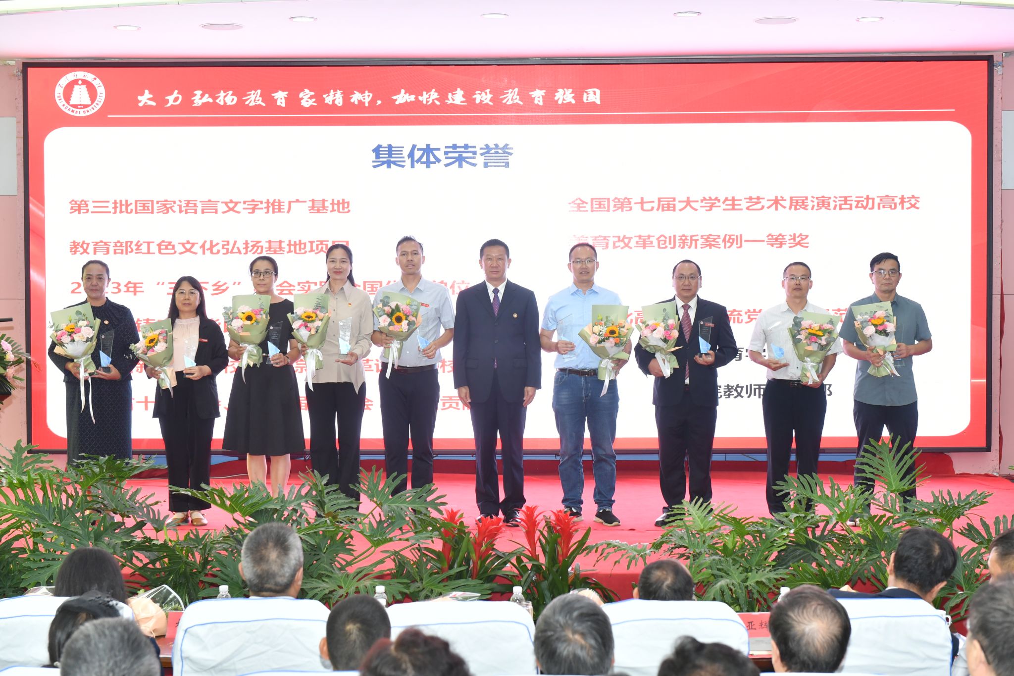 为大力弘扬教育家精神,激励广大教师潜心教书育人,积极投身教育强国建设实践,9月10日下午,玉溪师范学院举行庆祝第40个教师节暨2024年“感动玉师”荣誉教育大会。校党政领导,各二级学院、各职能部门主要负责人,荣退教师,受表彰教师,新入职教师,银龄教师,二级学院师生代表,师院附小师生代表等参加大会。红塔集团党委委员、纪委书记、工会主席左寿文,红塔集团办公室主任郭永康受邀出席。