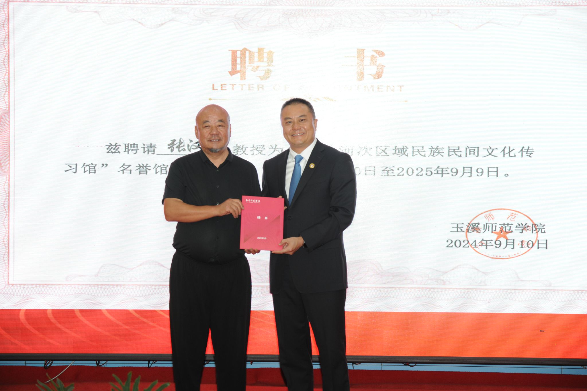 校长段红云为张汉东教授颁发“湄公河次区域民族民间文化传习馆”名誉馆长聘书。