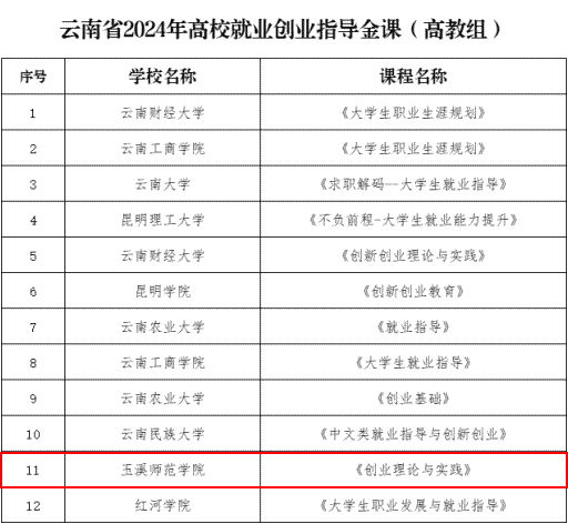 10月10日,中共云南省委教育工委印发《关于公布云南省2024年生涯教育和就业指导“四个一”活动之就业创业指导金课、直播课和生涯咨询特色工作室遴选结果的通知》,玉溪师范学院商学院李胤珠老师主讲《创业理论与实践》获认定为云南省2024年高校就业创业指导金课(高教组),教师教育学院党委副书记宋树兵老师“杏坛筑梦 引航成长”工作室获认定为云南省2024年高校生涯咨询特色工作室。