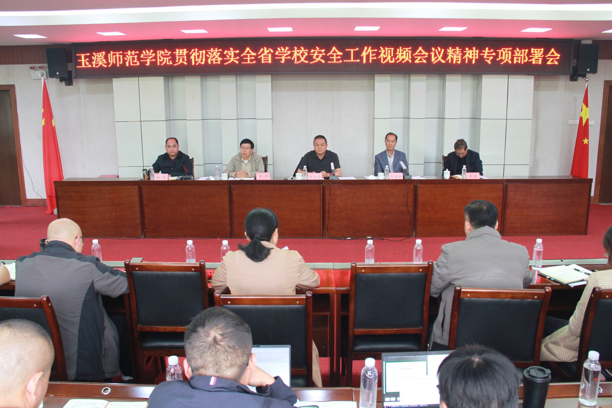 为认真贯彻落实云南省学校安全工作视频会议要求,总结近期学校安全工作情况,对下一步工作进行安排部署,10月23日下午,玉溪师范学院在图书馆3003会议室召开专项部署会。校长段红云、党委副书记张亚辉,副校长章新、李明、杨伟出席会议,各二级学院党委书记、院长,相关部门负责人参加会议,会议由杨伟主持。