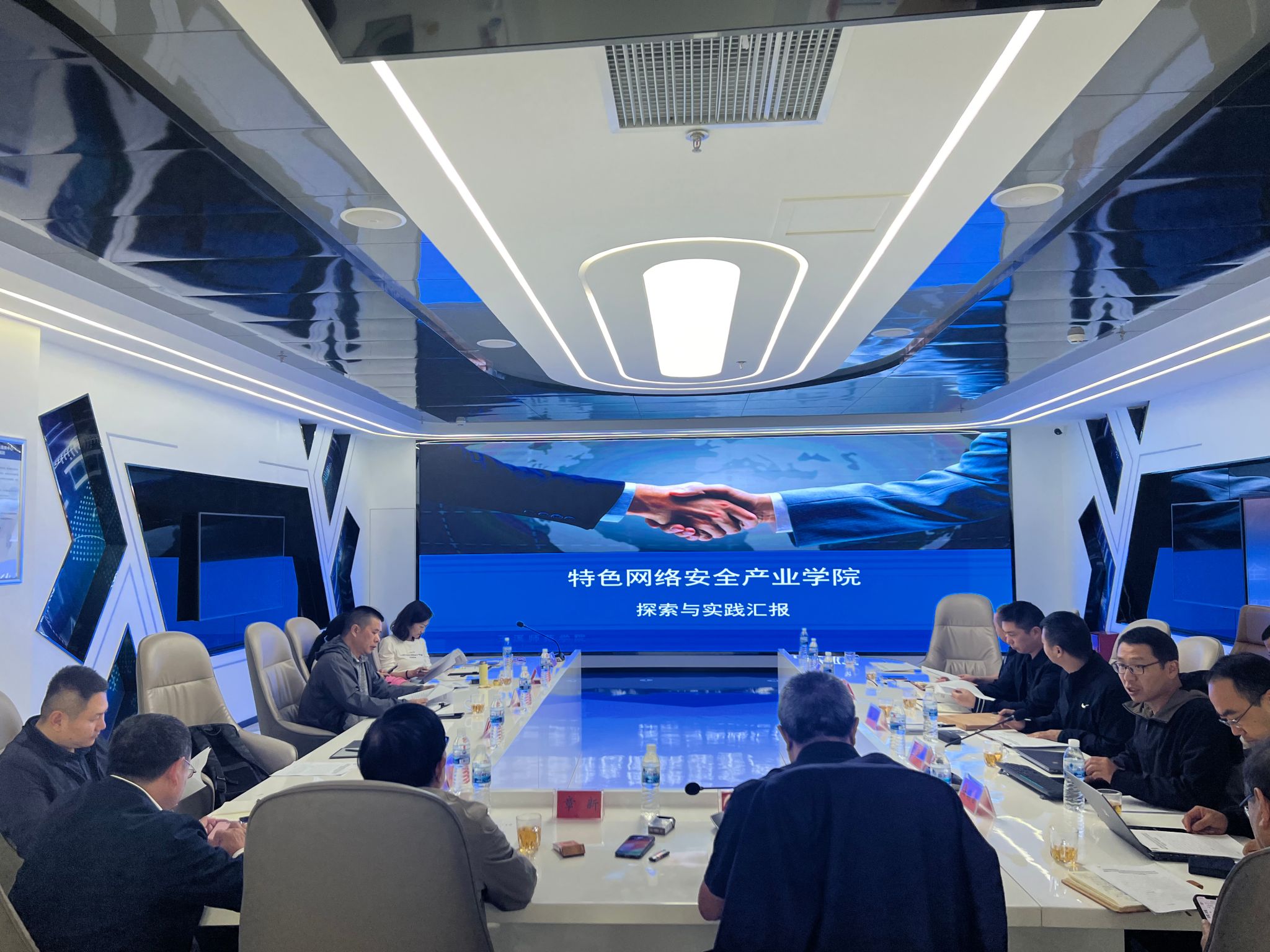 网络空间安全重点实验室副主任于勇涛就特色网络安全产业学院的探索与实践进行了汇报,与会领导从课程建设、实习实训平台建设、资产管理、合作风险等多方面给出了具体的指导性意见。