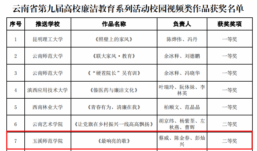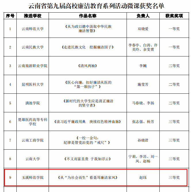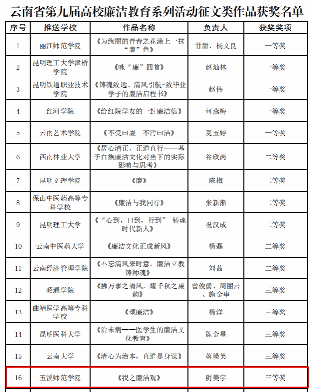 12月17日,由云南省教育工委主办的云南省第九届高校廉洁教育系列活动评选结果公布,玉溪师范学院选送的师生作品在此次活动中获二等奖1项、三等奖2项。