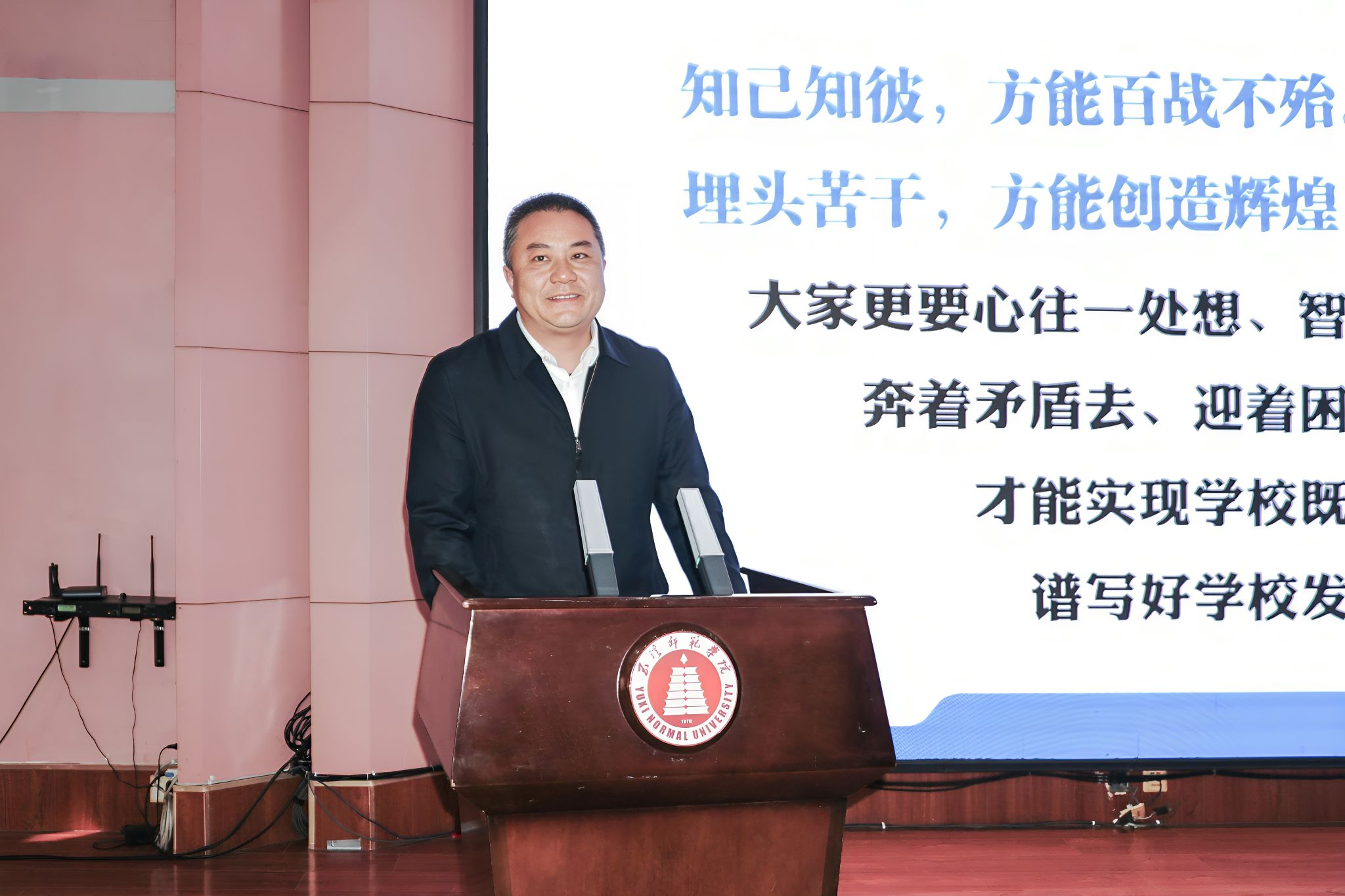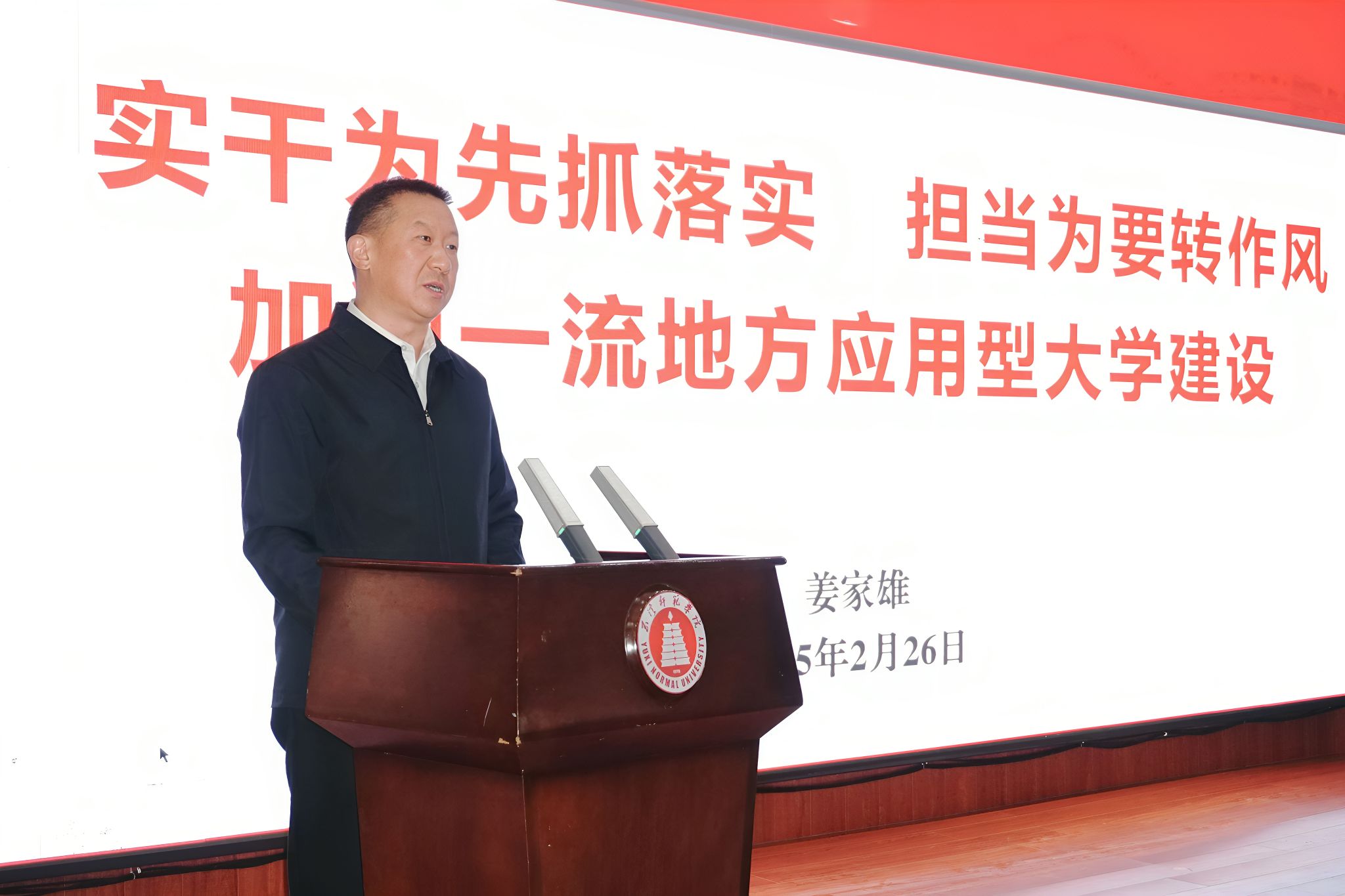姜家雄以《实干为先抓落实 担当为要转作风 加速一流地方应用型大学建设》为题讲话并提工作要求。姜家雄指出,2025年是贯彻全国教育大会精神、落实教育强国建设规划纲要的关键之年,也是“十四五”收官和“十五五”谋划之年,是面向十年建成教育强国全面布局、高位推进之年,也是玉师提质增效、加速发展的关键之年。2025年,学校发展开启新征程、进入新赛道,做好2025年各项工作,关系着学校“十四五”能否圆满收官、“十五五”能否顺利开局,更关系到学校长远发展的进与退、兴与衰。