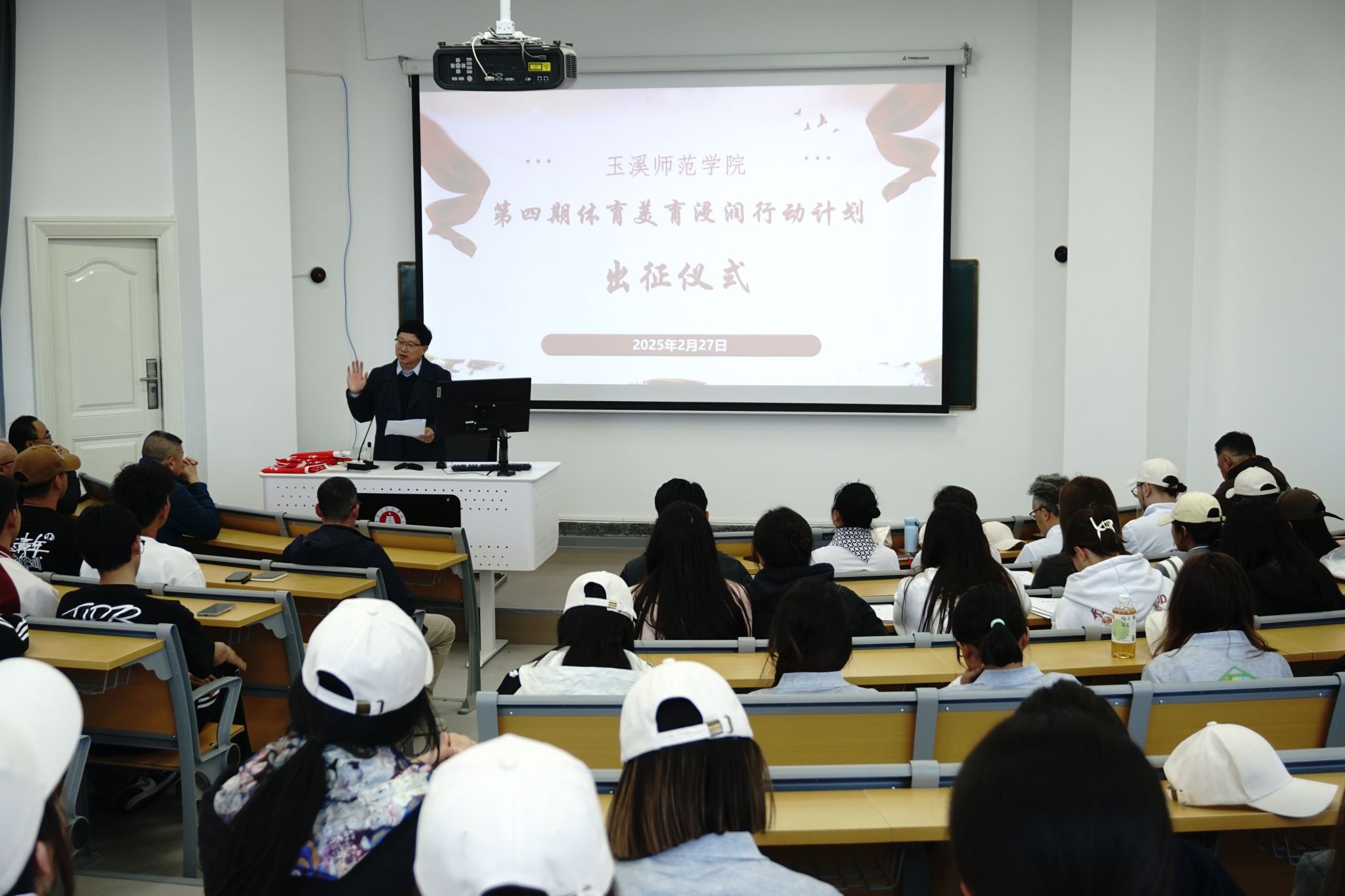 2月27日下午,玉溪师范学院在博思馆报告厅隆重举行第四期体育美育浸润行动计划出征仪式。副校长章新,教务处、音乐学院、体育学院、美术学院相关负责人以及全体支教师生齐聚一堂,共同见证这一意义非凡的时刻。出征仪式由教务处处长安镇宙主持。
