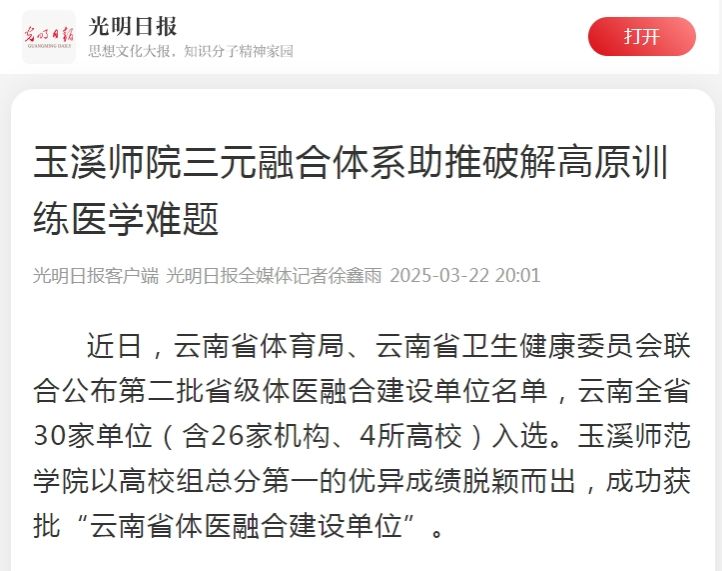 近日,云南省体育局、云南省卫生健康委员会联合公布第二批省级体医融合建设单位名单,云南全省30家单位(含26家机构、4所高校)入选。玉溪师范学院以高校组总分第一的优异成绩脱颖而出,成功获批“云南省体医融合建设单位”。