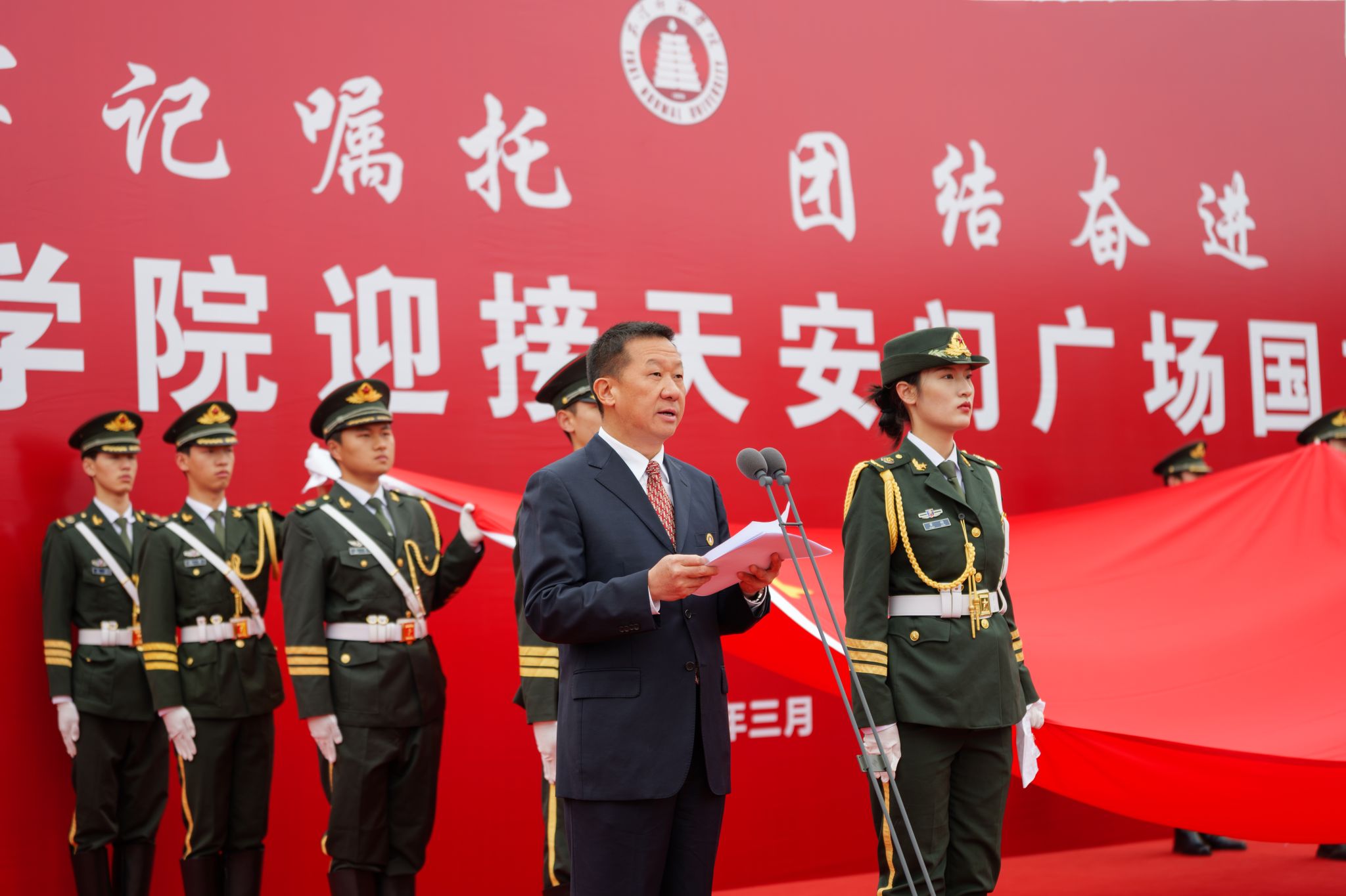 玉溪师范学院大学生国旗护卫队员、学校领导护送天安门广场国旗入场,大学生国旗护卫旗手接旗。