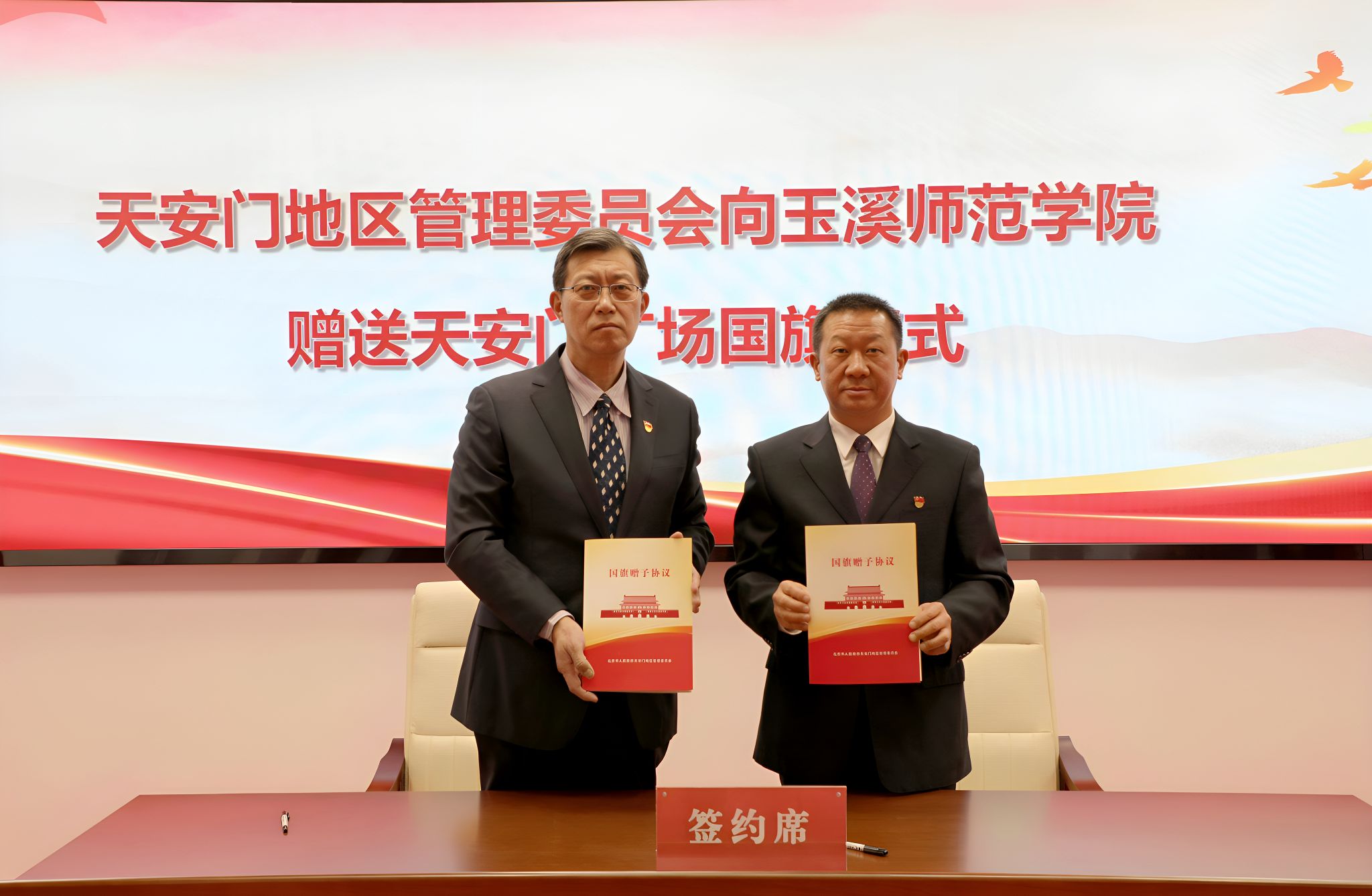 赠旗仪式在天安门国旗教育馆举行。北京市人民政府天安门地区管理委员会党组成员、副主任姚辉与玉溪师范学院党委书记姜家雄代表双方签订天安门广场国旗赠予协议。玉溪师范学院美术学院院长赵芳,教师许金、董绪兴参加赠旗仪式。姚辉向玉溪师范学院赠予国旗,就国旗保管使用提出相关工作要求。希望玉溪师范学院爱护好、保管好、使用好这面珍贵的国旗,把国旗作为爱国主义教育的重要载体,充分发挥国旗的教育引导作用。姜家雄向天安门地区管委会表示感谢,并赠送由学校教师董绪兴创作的聂耳铜像,表示学校将牢记嘱托,切实发挥好国旗的教育引导和价值引领作用,激励更多青年学子“同升一面旗,同唱一首歌”,为建设教育强国作出更大贡献。