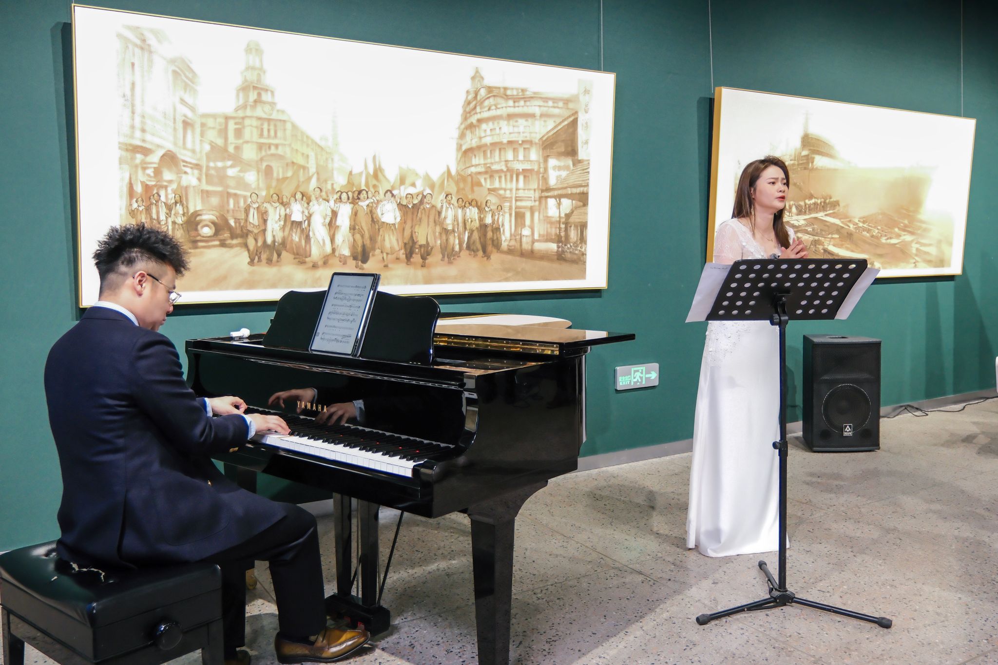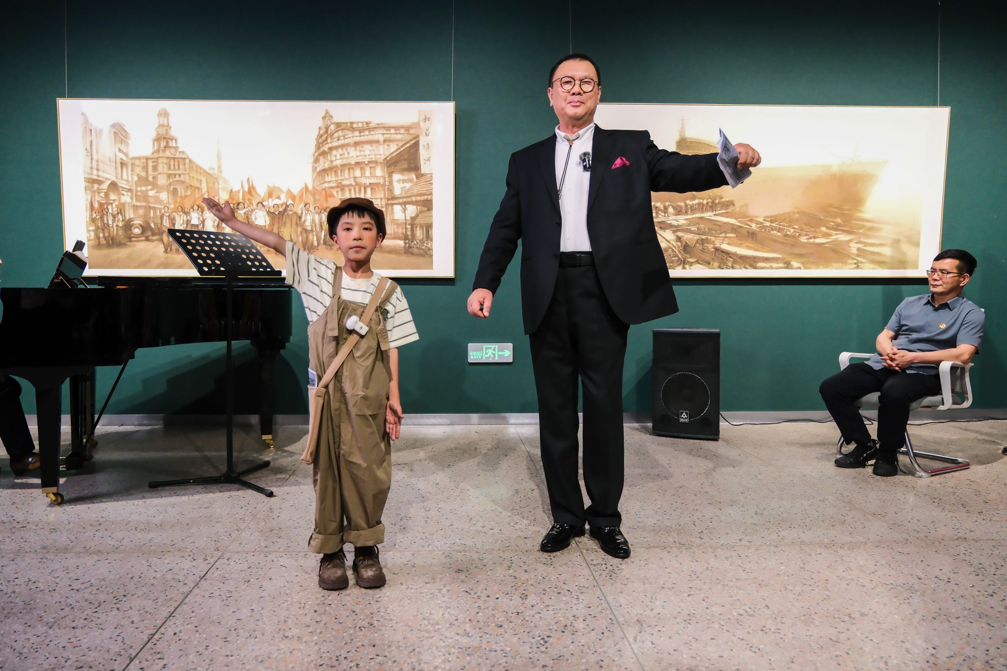 以画为窗,艺术使命赓续红色基因。学校银龄教师——中国音乐学院马金泉教授现场倾情演唱《大路歌》《码头工人歌》等作品,用浑厚男中音再现聂耳音乐的磅礴力量;马金泉教授和玉溪市第一小学王一雯同学共同演绎《卖报歌》,以艺术使命赓续红色基因,彰显艺术代际传承。