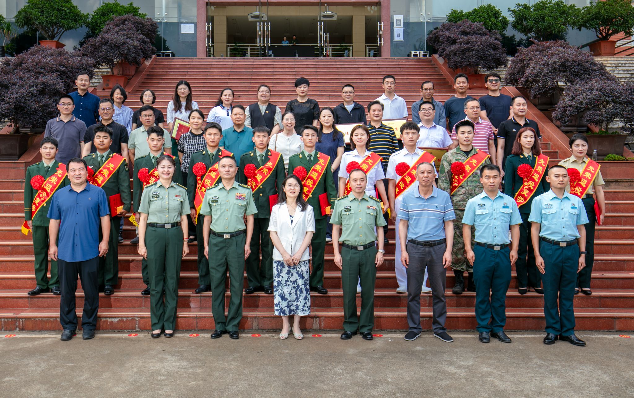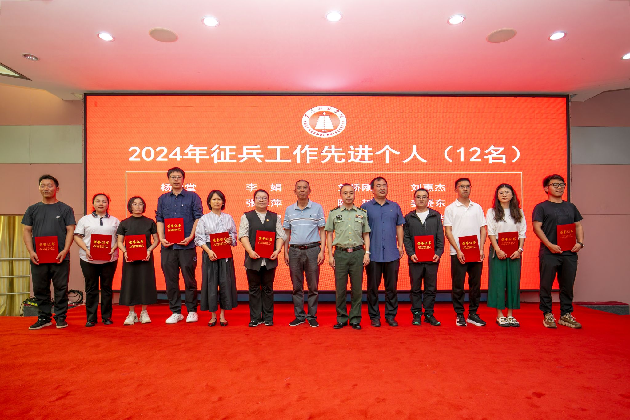 出席会议的领导、嘉宾为2024年退役复学学生佩戴光荣花、颁发纪念品;为学校2024年“大学生征兵工作先进集体”及“大学生征兵工作先进个人”颁发奖牌、荣誉证书。