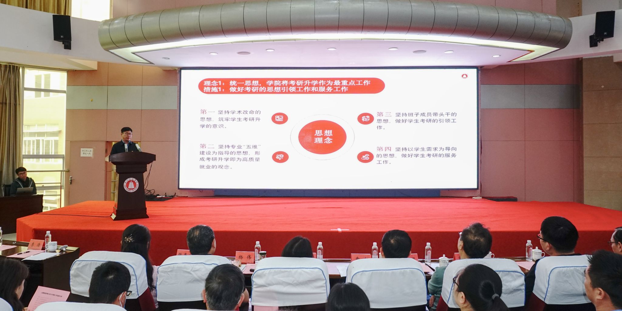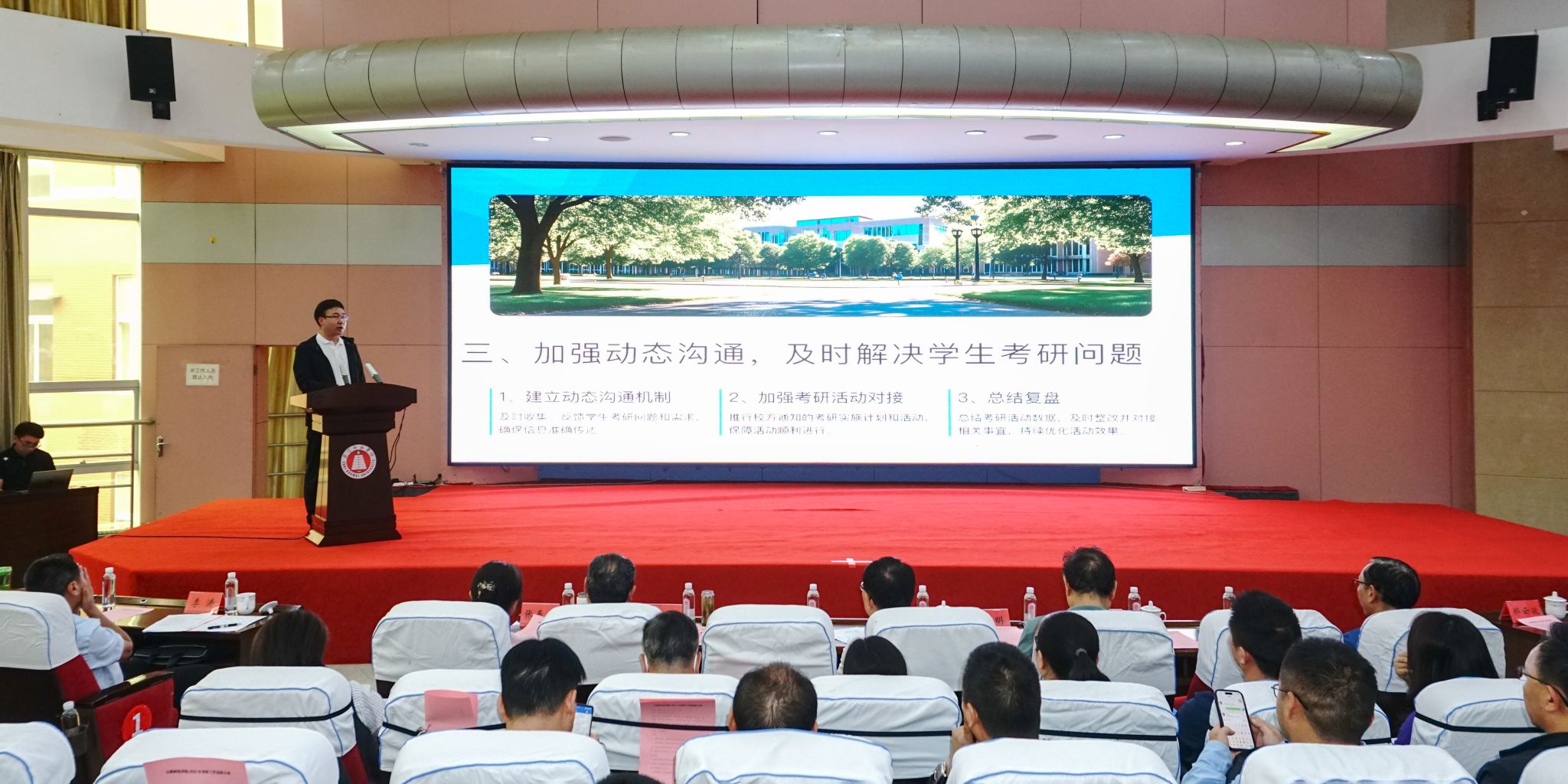 学校教务处、学生处、宣传部、图书馆主要负责人;各二级学院党委书记、院长,党委副书记、副院长,专业负责人、班主任,有考研意向的各学院学生代表参加会议。