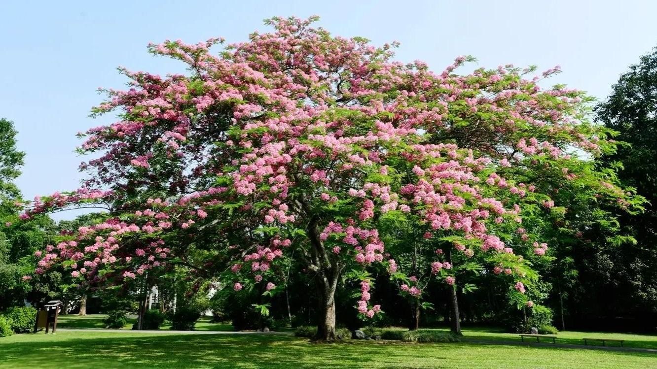 据悉,粉花山扁豆,又名爪哇腊肠树、爪哇决明,树冠如伞,枝叶茂盛,翠绿浓郁,花色粉红,是优良的园林绿化树种,荫美并备,对丰富校园景观和改善生态植被环境具有重要意义。