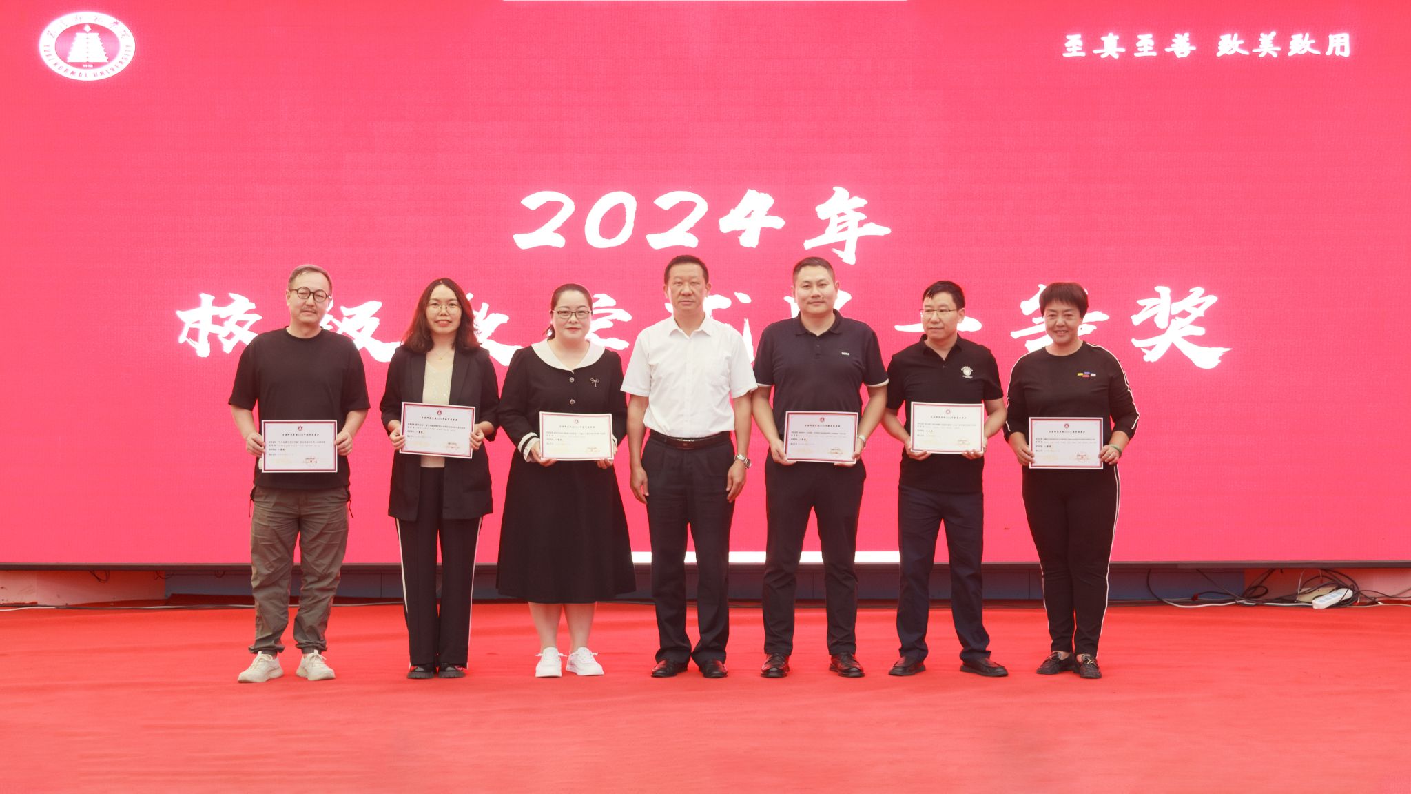 为激励广大教师潜心教学、追求卓越,营造重视教学、崇尚创新的浓厚氛围,会议表彰了2024年在教育教学改革与实践中取得突出成效的优秀教师和团队,充分肯定了他们在推动学校教育教学改革、提升人才培养质量方面所做的积极贡献。出席会议的校领导为获奖代表颁发证书。