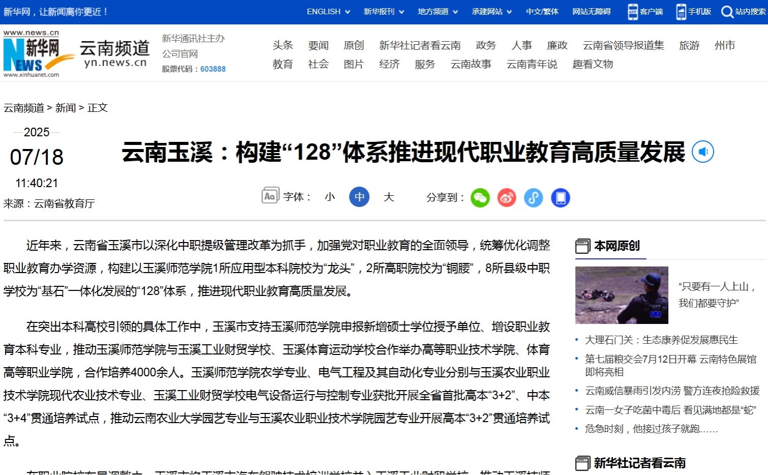 近年来,云南省玉溪市以深化中职提级管理改革为抓手,加强党对职业教育的全面领导,统筹优化调整职业教育办学资源,构建以玉溪师范学院1所应用型本科院校为“龙头”,2所高职院校为“铜腰”,8所县级中职学校为“基石”一体化发展的“128”体系,推进现代职业教育高质量发展。