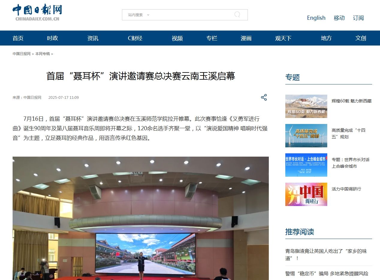 7月16日,首届“聂耳杯”演讲邀请赛总决赛在玉溪师范学院拉开帷幕。此次赛事恰逢《义勇军进行曲》诞生90周年及第八届聂耳音乐周即将开幕之际,120余名选手齐聚一堂,以“演说爱国精神 唱响时代强音”为主题,立足聂耳的经典作品,用语言传承红色基因。