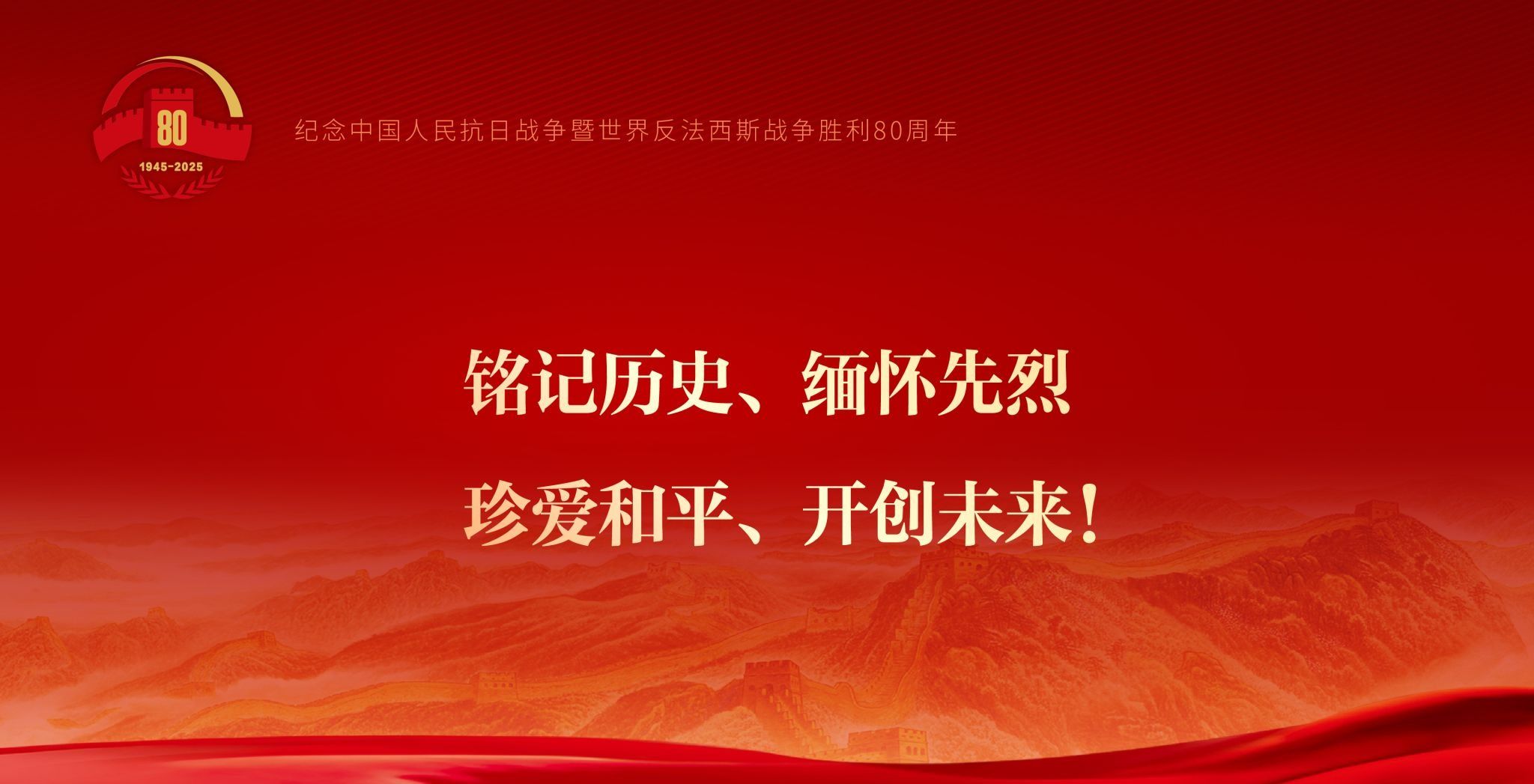 今天,我们隆重集会,纪念中国人民抗日战争暨世界反法西斯战争胜利80周年,共同铭记历史、缅怀先烈、珍爱和平、开创未来。