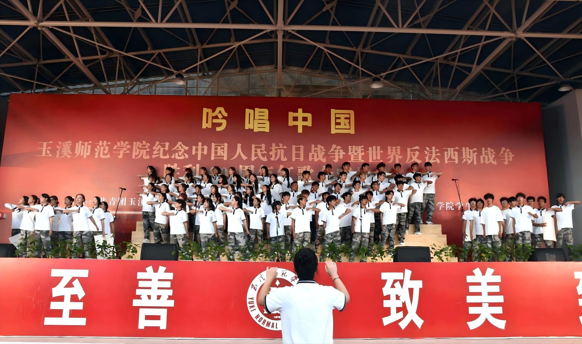 9月13日晚,玉溪师范学院在田径场举办以“吟唱中国”为主题的纪念中国人民抗日战争暨世界反法西斯战争胜利80周年红歌合唱比赛。玉师青年以歌声铭记历史,以旋律礼赞祖国,在激昂的合唱中传承奋斗力量,凝聚时代精神。各学院党委副书记、辅导员,校团委专职团干及2000余名新生参加活动。