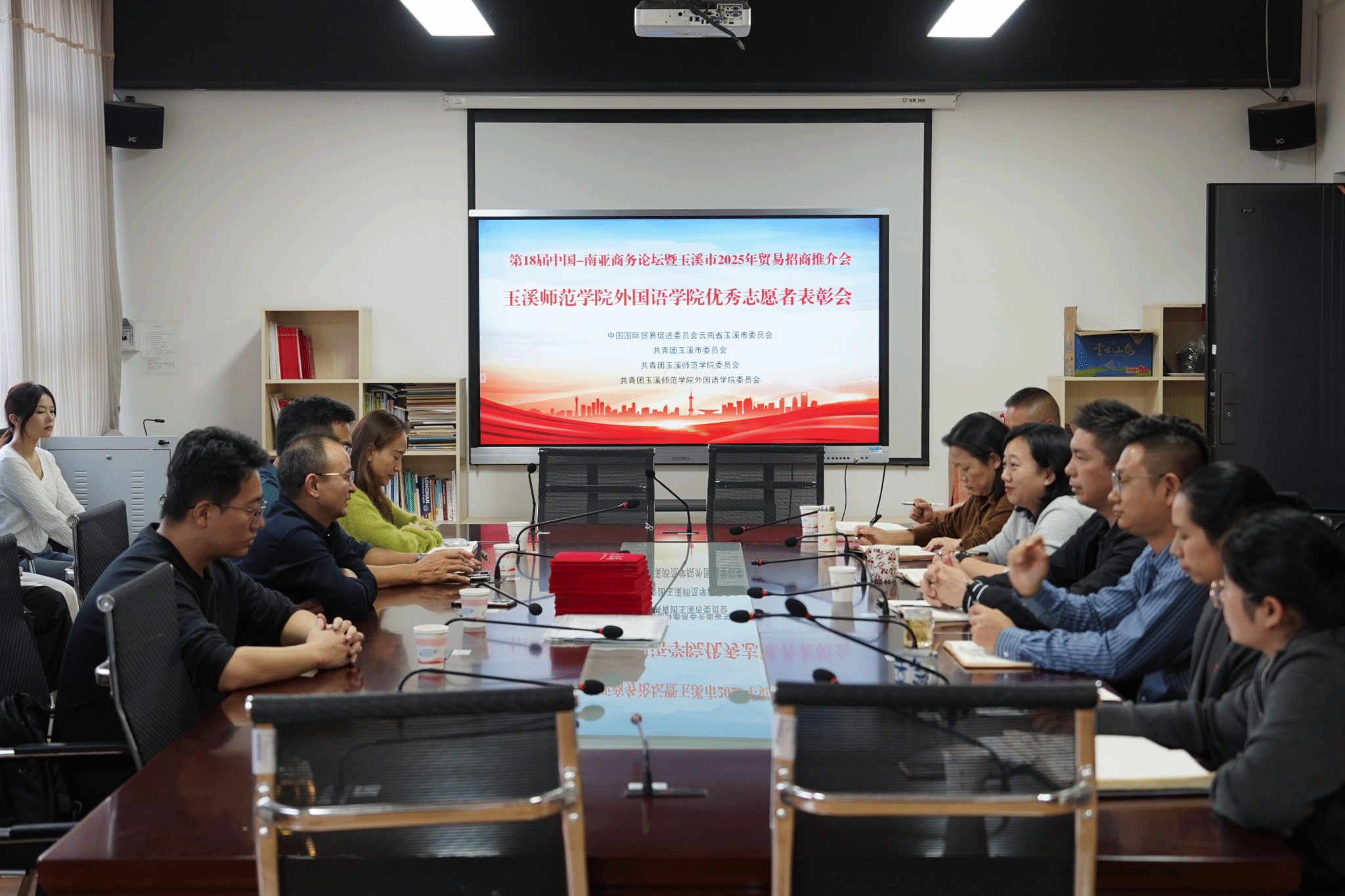 玉溪市贸促会张国强,团市委普赓頔;玉溪师范学院外国语学院党委书记张敏、副书记杨梅,副院长付丽彬,团委书记马继彬;校团委李峰宇、王震洋、端艳参加会议。