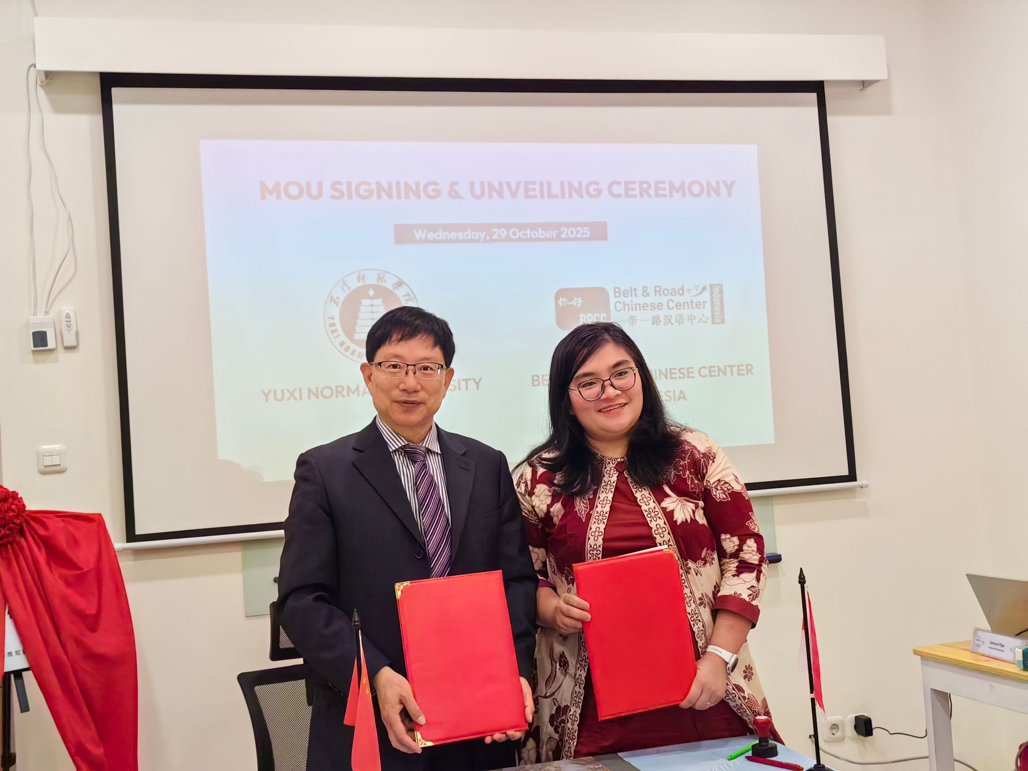 章新介绍了玉溪师范学院的办学情况和国际合作交流情况,推介了学校国际合作项目。与会人员围绕玉溪师范学院学生汉语带薪教育实习、印尼学生到玉溪师范学院留学和短期交流学习等项目进行了充分交流和讨论。双方共同签订了《中国玉溪师范学院语言文化中心合作协议》,为“中国玉溪师范学院语言文化中心”揭牌。会后,访问团深入汉语教育实习点进行了实地考察。