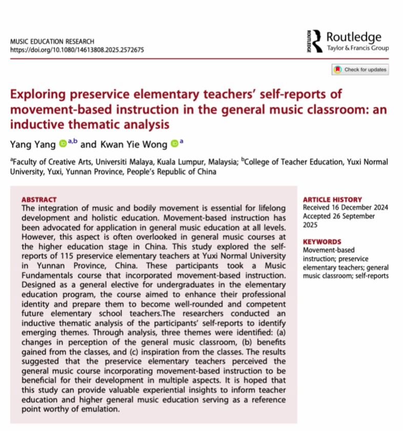 11月1日,玉溪师范学院教师杨漾以第一作者身份,在英国 Taylor & Francis 集团旗下知名学术品牌 Routledge 出版的国际核心期刊Music Education Research上发表题为 “Exploring Preservice Elementary Teachers’ Self-Reports of Movement-Based Instruction in the General Music Classroom: An Inductive Thematic Analysis” 的学术论文。