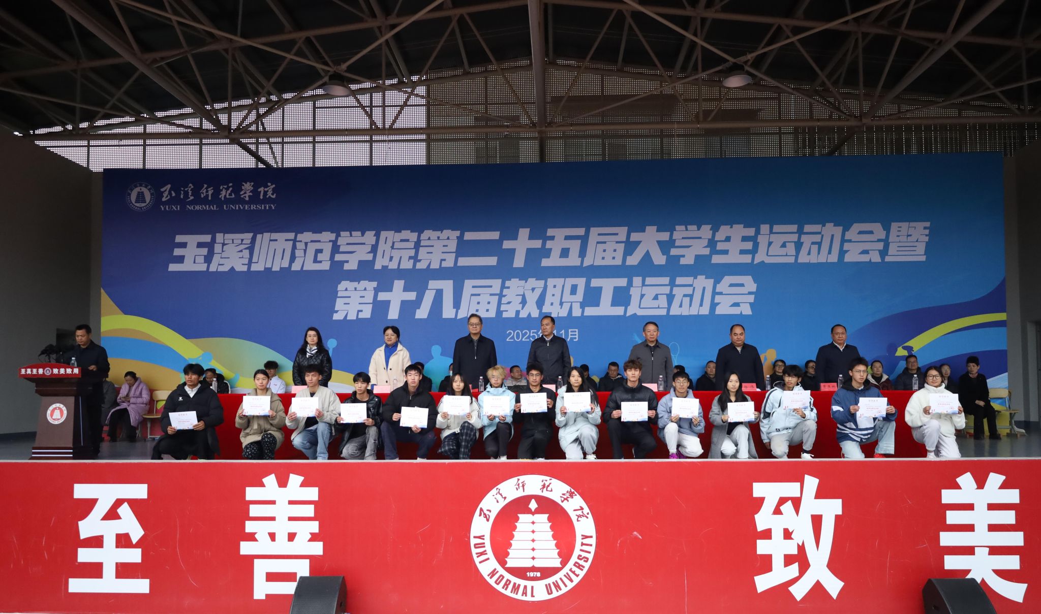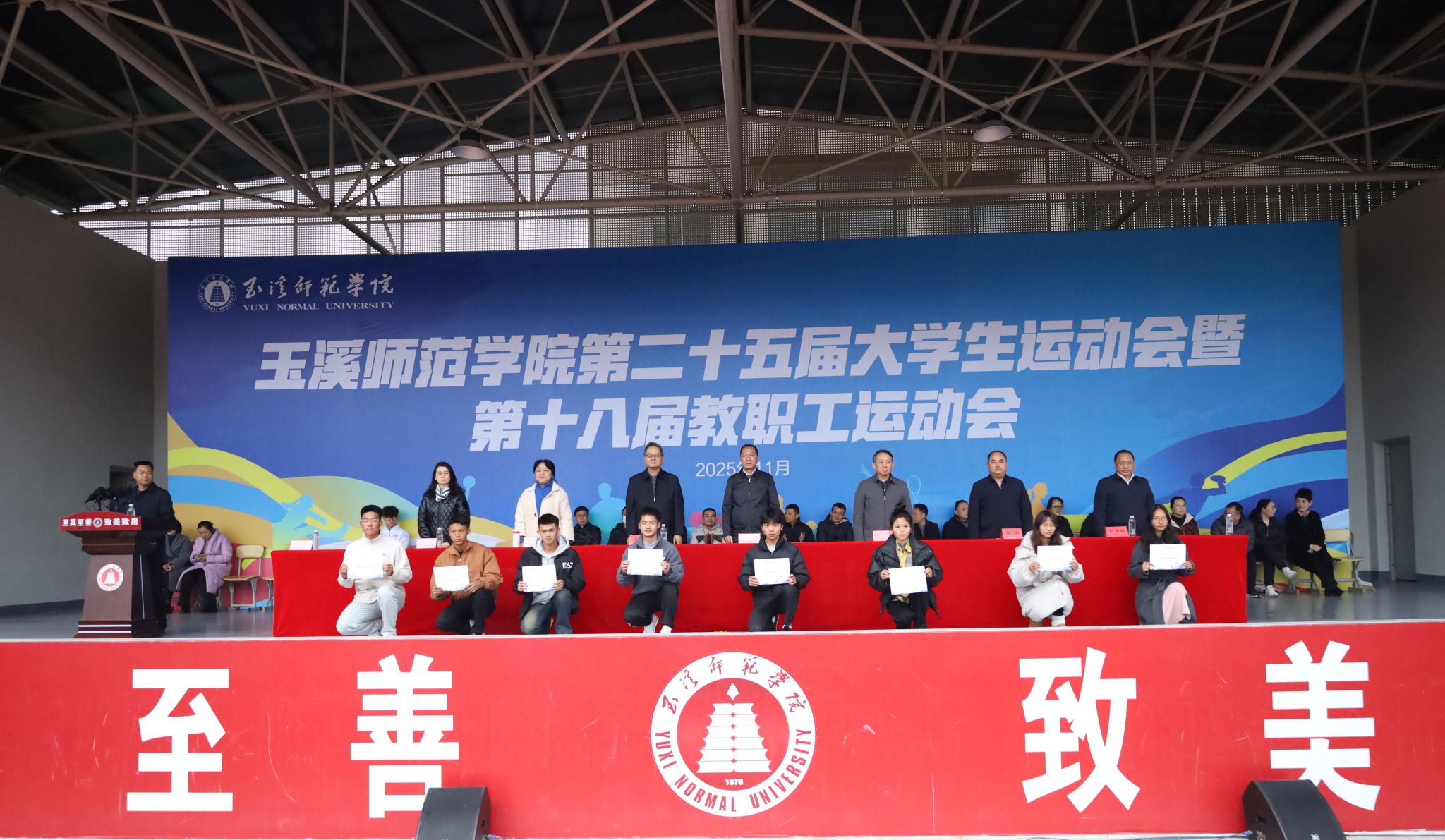 闭幕式上,副校长杨伟宣读关于玉溪师范学院第二十五届大学生运动会先进集体和个人的表彰决定,体育学院院长普春旺宣布本届运动会比赛成绩。校妇联常务副主席艾玉宣布教职工消防技能项目、应急救护接力项目获奖名次;校团委副书记余家赛宣读玉溪师范学院2025年啦啦操比赛获奖名单。
